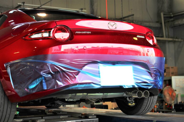 リアバンパー部を養生し、車両に傷がつかないよう配慮しながら進めていきます。