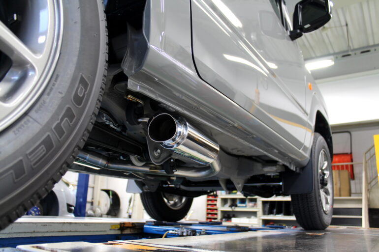 純正マフラーは後方排気ですが、これを右サイドへとレイアウト変更。