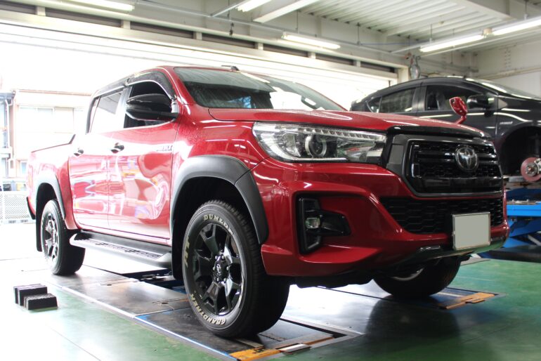 本日はこちらのハイラックスへ人気のレンコンホイールを装着です(^^)/