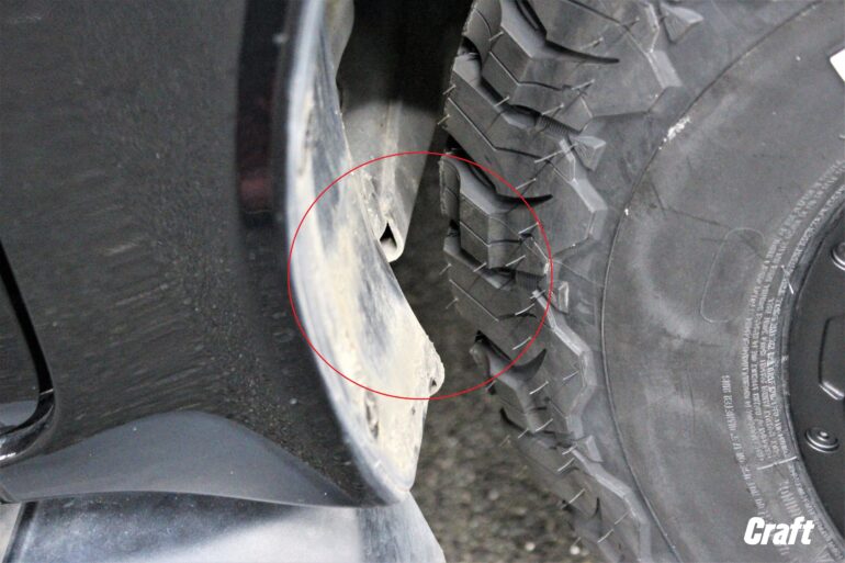 ちなみに、HILUX前期モデルはフェンダーの形状的に 265/70-17 を装着しても赤丸部には干渉しません。