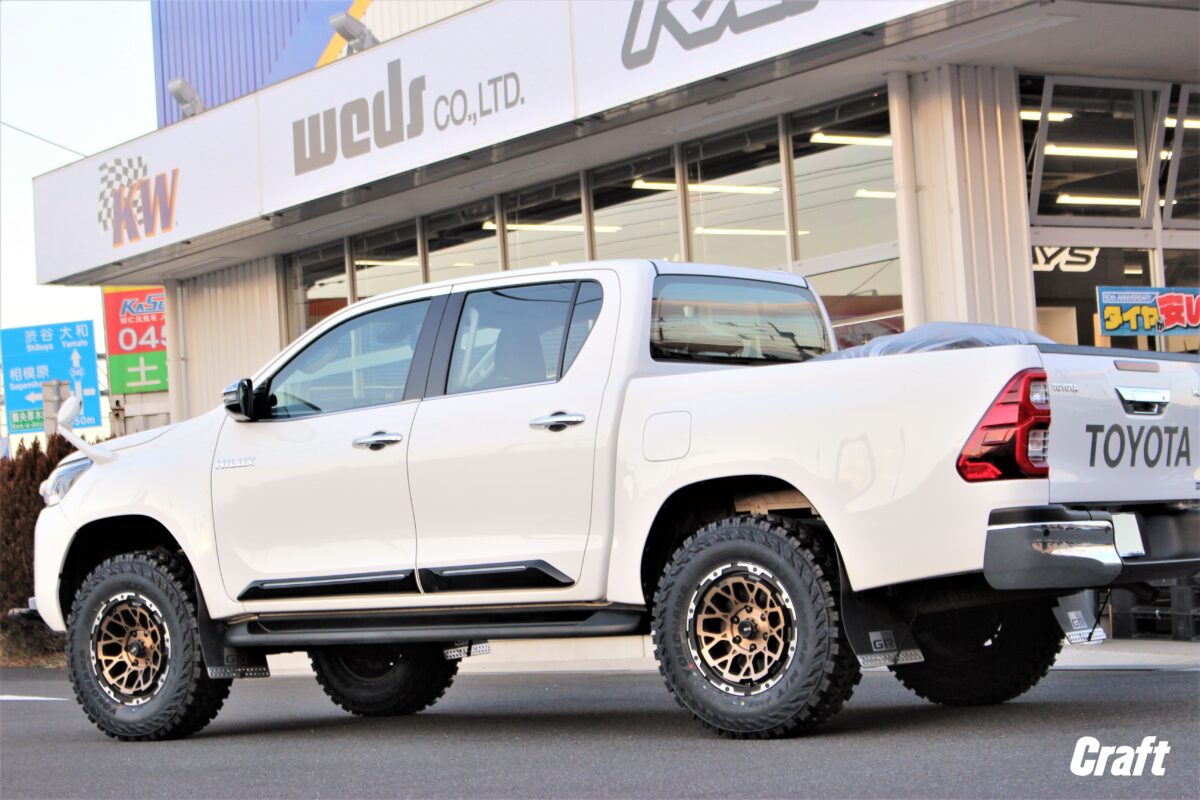 HILUXならではの前下がりも補正しつつ、バランス良く仕上げてあります。