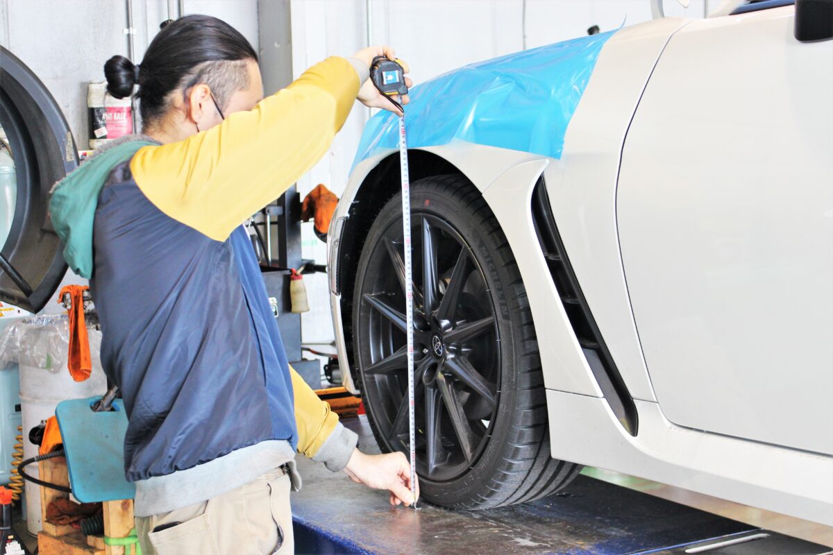 その間にスタッフ長縄に純正車高を測定してもらいます。
