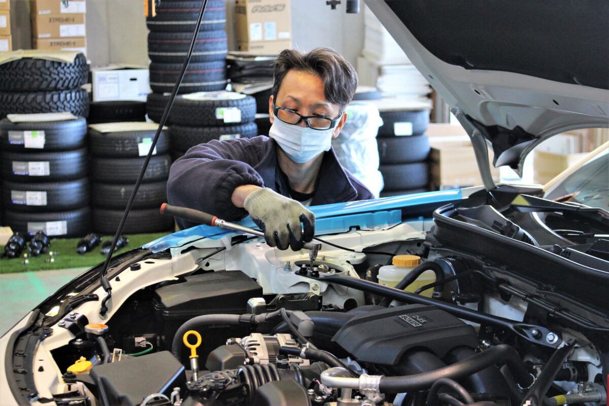 車高調組付け前に事前打ち合わせ寸法を大野課長が調整中。