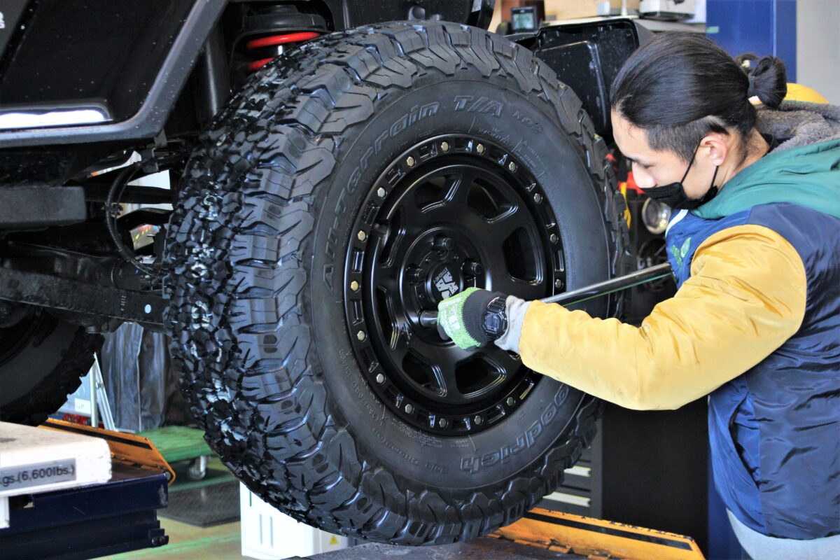 既にリフトアップが施され、次カスタムパートとしてタイヤ&ホイールカスタムのご用命を頂きました!