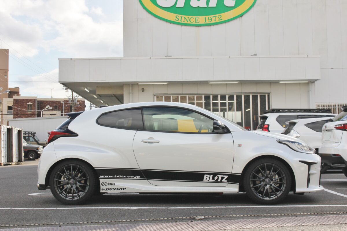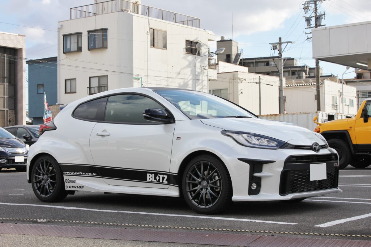 冬仕様という事で、スタッドレスタイヤを装着中のブリッツのデモカーGRヤリス。