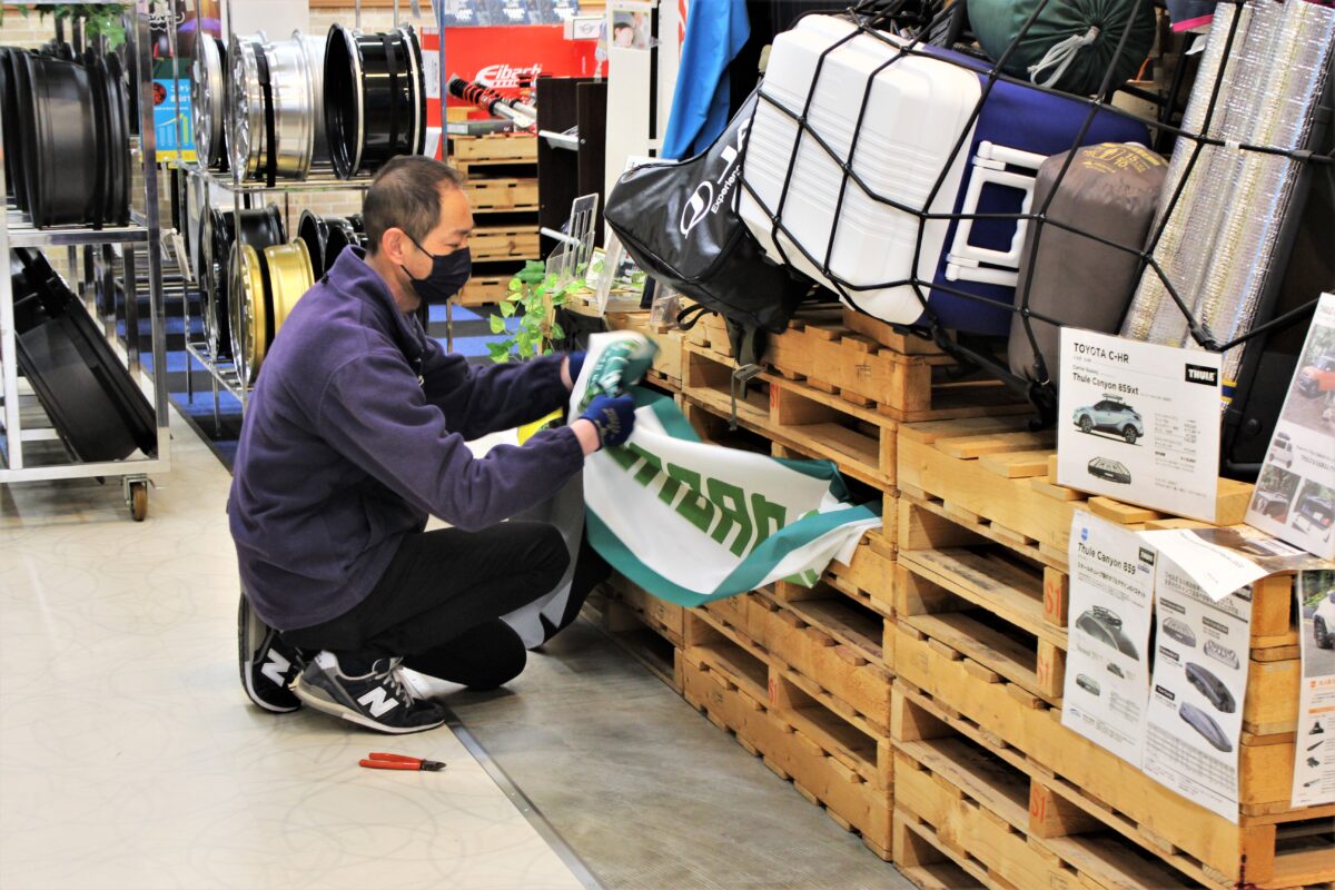 ホイール展示もアレコレ入替えて装飾POPを取付けていきます。