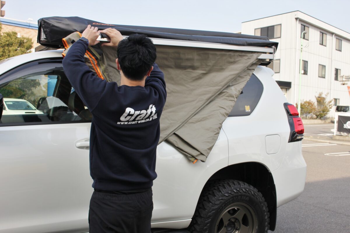 ルーフには、フロントランナーのルーフラックとダーチのサイドオーニングを装着しています。