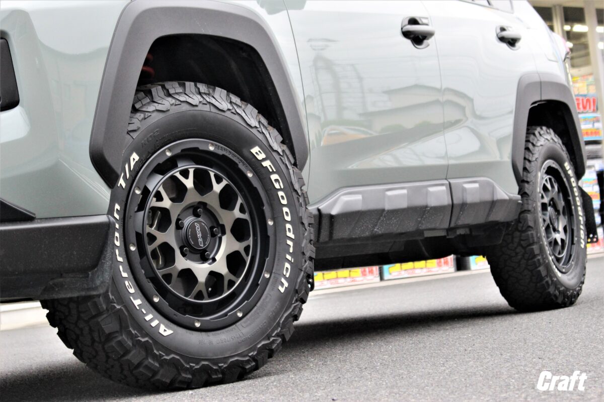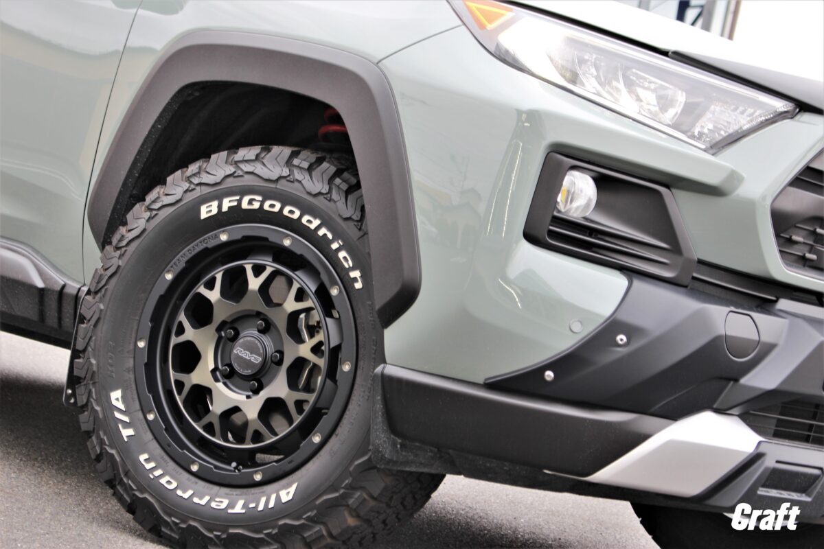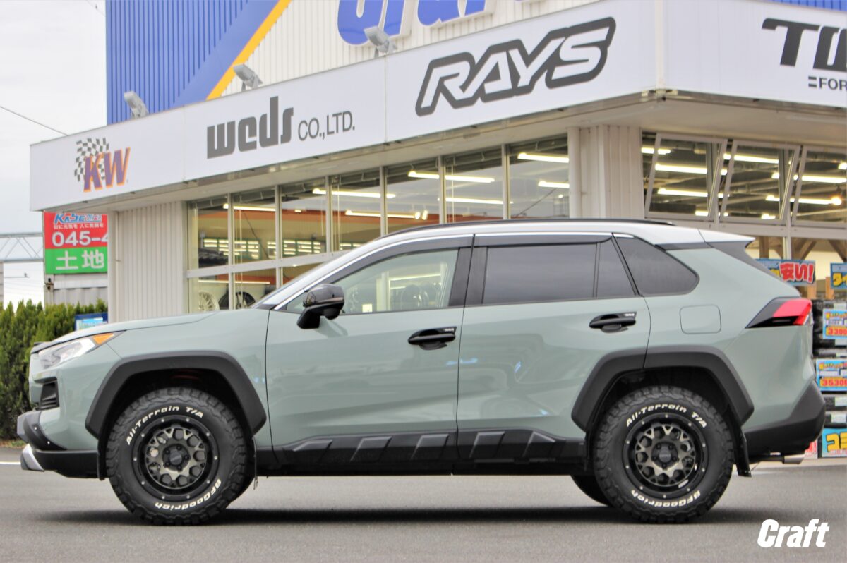 RAV4に太履き265/65-17を装着!! 出ヅラはどんな感じに仕上がる???   いつもありがとうございます!!クラフト厚木店・のりかずです。   本日のご紹介はI様・RAV4。   タイヤ・ホイール交換に加えリフトアップも一緒に施工していきます!     まずはこちら、入庫前のRAV4です。   今回のRAV4は「アドベンチャーオフロードパッケージ」というグレード。   RAV4に乗っている方なら知っているかもしれませんが、ほかグレードよりも10mm程車高が高いグレードになりますね。   そして今回取り付けたリフトアップアイテムは「ACC イージアップ1.5インチキット」、約38mm車高が上がるアイテムとなります。   38mm+10mmで48mmってことは約2インチ近く上がることになりますね♪     そして今回取り付けていくタイヤホイールがこちら   ホイール:RAYS デイトナM9+ 7.0J-17インチ   タイヤ:ヨコハマ ジオランダーAT4 G018 265/65-17   RAV4では245/65-17をよくご注文いただきますが、今回はもうワンサイズアップの265/65-17をチョイス。   外径が更に大きくなるのでリフトアップを行っている車軸なら、バランスはいい感じです✨✨     265/65-17となるとタイヤの存在感がすごいですよね👍   ちなみに外径の差となると直径で約49mm、半径で約24mmとなっています。   今回のリフトアップと合わせると約72mm(3インチ)になりますよ(笑)       見比べてみるとだいぶ変わっていますよね👍   ちなみに「265/65-17を装着したい!けど干渉問題はどうなの?」とよくご相談を頂くことが多いです。   しかし、ホイールサイズによってかなり変わるのでその都度ご相談くださいね♪     そして最後に出ヅラです!   いい感じの出ヅラに仕上がってくれていますよ!   RAV4でもツライチにしたいって方は265/65-17を検討してみてはいかがでしょうか!   注意事項等もありますので、店頭で聞いてみてくださいね♪   それではご相談お待ちしております!!     I様この度はクラフトをご利用いただきありがとうございました!!   ホイールの入荷にかなりお時間をいただいてしまい申し訳ございませんでした。。。。💦   265/65-17の迫力すごかったですよね!   そして何より72mmの車高の変化は驚きではないでしょうか!   また、ぜひクラフトをご利用ください!!   管理番号:0412510051001