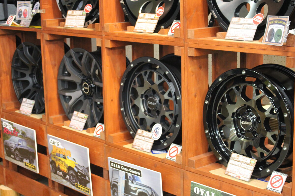 当店スタッフの趣味趣向により、拡大展示中のオフロードホイールコーナー。