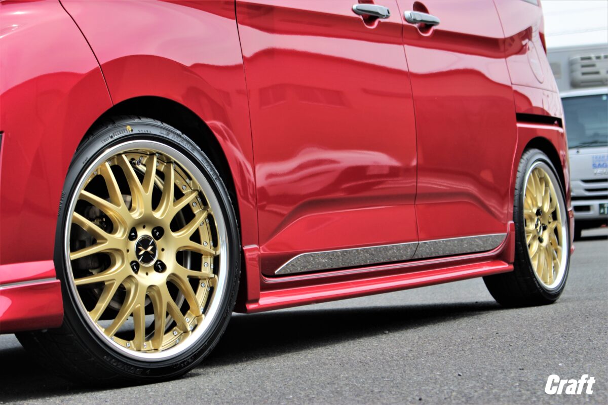 まずは見た目、タイヤのショルダー部が引っ張られる事で 「 カスタムカー 」 らしい仕上がりとなります。