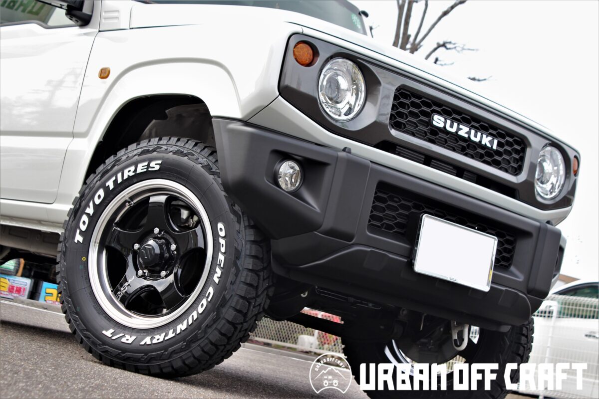 ■【ジムニー】H12ショットガン装着&カントリーサスペンションキットでリフトアップ!! 皆さんこんにちは、アーバンオフクラフト中川店の加藤です。 本日はJB64ジムニーのホイール交換とリフトアップをご紹介します。 ■【MID wheels】NITRO POWER H12 SHOTGUN 12個穴が開いたようなレンコンデザインのホイール、H12ショットガン。 リムにギア感のあるギミックをこらし、ピアスボルト風のデザインでオフロードホイールらしさを引き立てます。 ホイールカラーは人気な艶なしブラック、"バレルブラック"カラーを装着します。 ■【YOKOHAMA】GEOLANDAR AT4 G018 アグレッシブなブロックパターンは残しつつ、様々な路面環境に対応可能なオールテレーンタイヤ、ジオランダーAT4 G018を組み合わせます。 同じジャンルのATタイヤにおいて、ヨコハマタイヤからはX-AT G016もリリースされています。 X-AT G016と比較してAT4 G018はスノーフレークマークを獲得しているため、 高速道路などの"冬用タイヤ規制"下においても通行が可能となっています。 ※スタッドレスタイヤではございませんので過酷な雪道では走行をお控えください。 ■【4×4エンジニアリングサービス】カントリーサスペンション 老舗ヨンクメーカーが手掛けるカントリーサスペンションキット、通称:カンサスで足回りのセッティング&約30mmのリフトアップを行います。 フロント/リアともに減衰力調整可能なダイヤルがついており、路面環境に合わせてお好みの調整ができます。 ダイヤルは工具など不要ですので比較的簡単に減衰力の調整が可能です。 車高の変化によって変化してしまうホーシングを適正値に補正するために、 ロッドの長さが調整可能なラテラルロッドも付属しているコンプリートセットです。 純正状態のフェンダークリアランスです。 迫力を出すためにリフトアップをしていきます。 サスペンションを交換し、約30mmのリフトアップを行うとフェンダークリアランスはご覧の通り。 より迫力のでる仕上がりでセッティング完了です。 足回り部品交換に伴う各部の数値のズレを3Dアライメント調整にて補正します。 調整後に試走を行い、ハンドルセンターを確認したら作業完了です。 それでは全体のビフォーアフターをご覧ください♪ 【BEFORE】 【AFTER】 WHEEL:【ナイトロパワー】H12ショットガン COLOR:バレルブラック TIRE:【ヨコハマ】ジオランダーAT4 G018 SUS:【4×4エンジニアリングサービス】カントリーサスペンションキット 【BEFORE】 【AFTER】 重厚感のあるH12ショットガンはオフロード走行を視野に入れてデザインされている車両と上手にマッチします。 純正状態と比較してもリフトアップによる存在感と併せて迫力アップですね。 この度はアーバンオフクラフト中川店をご利用いただきありがとうございました! ジムニーカスタムに関するご相談・ご用命は実績豊富な当店にお任せください。 皆様のご来店をスタッフ一同お待ちしております(*^_^*) アーバンオフクラフト中川店でした。 ~開催中のイベント~ 管理番号:0092505301008