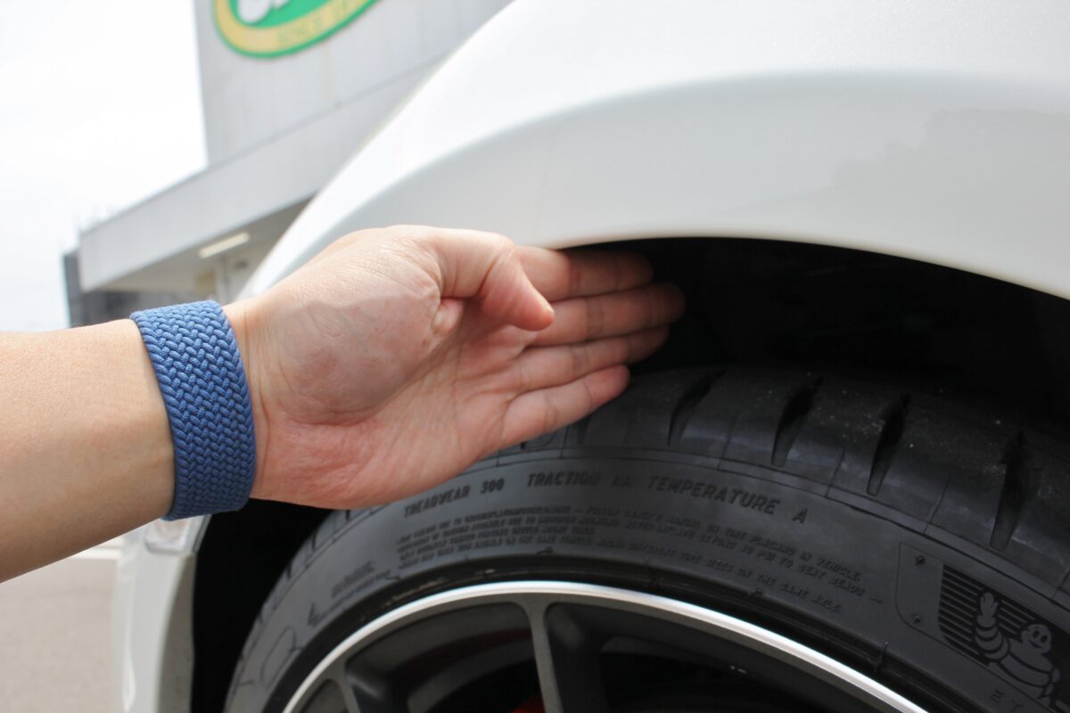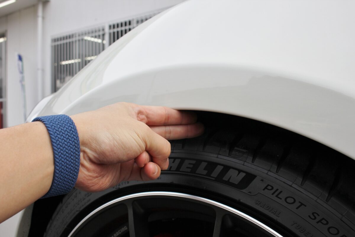 やや腰高感のある純正車高から、指2本分のクリアランスでセット。