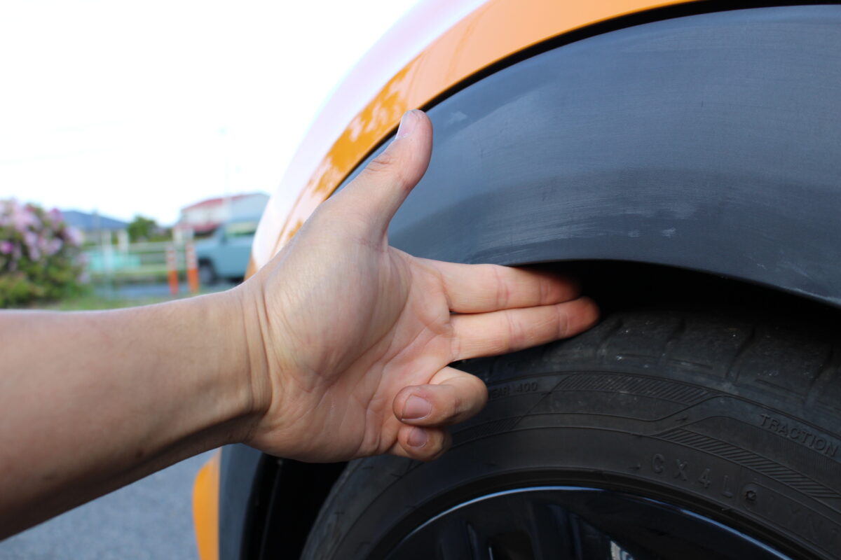 フェンダークリアランスは指2本がギリギリ入らないくらい。