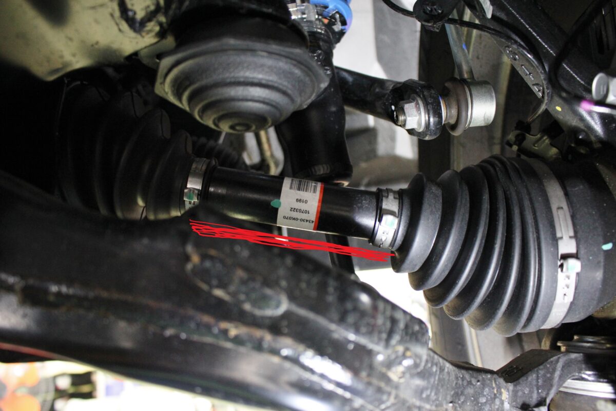 リフトアップをすると、写真のようにドライブシャフトに角度が付きすぎてしまいます。(通常は、地面に対して平行に近い)