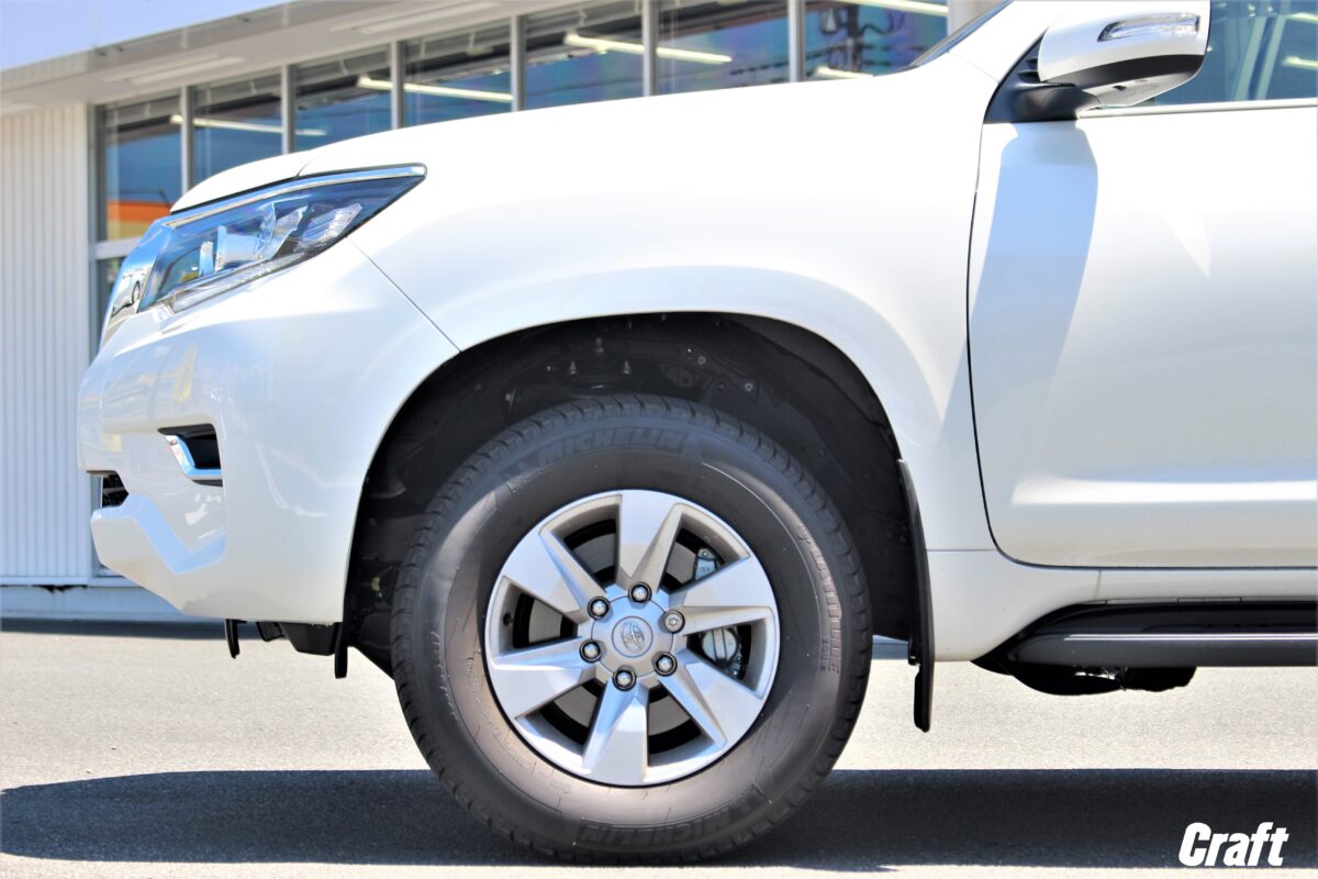 前後のバランスを考慮するなら前後で0.5インチ差がオススメ!! モトレージならリフトアップ量が選べるので便利ですよぉ~✨     いつもありがとうございます、クラフト厚木店・佐藤です!!   本日のご紹介は静岡県からお越しのW様・150プラド GDJ150W。   型式からも分かる通り、今回のカスタムベース車輛は ” ディーゼル車 ” となりま~す✨   タイヤ・ホイール選びに関してはディーゼル車・ガソリン車での違いはありませんが、リフトアップアイテムは別。   そんな事から間違った品番を選んでしまわないように注意する必要があります。。。     上の画像はご入庫時のワンショット📷✨   装着している純正ホイールは19インチとなっていますね。。。 👀   言わば都市型SUVをイメージさせる 「 アーバンスタイル 」 と呼ばれるプラドです。   そして、本日は ” 脱都市型SUV ” を目指した 「 アーバンオフスタイル 」 に仕上げて参りま~す🔧🔧     本日のリフトアップに使用したアイテムは 「 モトレージ TERRA コイルスプリング 」 となります。   鮮やかなブルーのスプリングですが、注目して欲しいのはスプリングカラーではなく 「 リフトアップ量が選べるところ 」 にあります!!   モトレージさんのリフトアップスプリングは 0.5インチ刻み でリフトアップ量を選ぶ事が出来る優れモノ 👍   そんな事から、150プラドのお悩みでもある ” 前下がりの補正 ” や更なる迫力を求めたリフトアップまで選択可能。   今回チョイスしたリフトアップ量は果たしてどの位だったのでしょうか。。。👀👀     コチラの画像は全てのパーツを組付けた後に行う アライメント調整 を行っている際の1枚です。   150プラドは普通の車輛に比べると調整にやや難易度が追加される車輛です。   ちなみに調整ヶ所ですが、リアに関しては無し、もしくわラテラルロッドを装着した際の左右調整。   そして調整にコツが必要なのがフロントです。   一般的な車輛のフロント調整ヶ所はトゥのみとなり、多くはタイロッド部で調整を行います。   その点ではプラドも同じ。   ですが、プラドに関してはトゥにプラスして 「 キャンバー・キャスター 」 と言う調整も出来る仕組みになっているんです!!     上の画像はその キャンバー・キャスター を調整する部位となります。   これが左右に計4ヶ所ありますが、その調整方法がちょっと特殊なんです。   トゥに関しては左右で独立しているので片側づつ調整すれば良いのですが、キャンバー・キャスターに関しては2つが連動する仕組みとなっているので2つの数字を確認しながら徐々に数字を煮詰めていくと言う作業となり、これが技術のいる作業なんです。   そんな事から調整に難易度が加わると言う表現を使った訳です!!   当店ではアライメント調整作業のみでのご利用も可能ですので、愛車のメンテナンスにぜひご利用下さいね✋✋     それでは完成したプラドをチェックしてみましょう!!     この肉厚タイヤ。。。 そしてリフトアップによる迫力ある仕上がり。。。   これぞオーナー様が求めていた 「 アーバンオフスタイル 」 だった訳ですっ✨     ご購入いただいたホイールは 「 ウェッズ マッドヴァンス06」 17インチ。   最近良く見掛けるビードロック風デザインとは異なり、飾りつけを極力なくしたシンプルかつマッシブなアイテム。   スポーク部をリムよりひと回り小さくする事で、タイヤがより肉厚に見えると言う工夫がなされた一品。   カラーはフルマットブラックとなり、ツヤを完全に消した武骨な色味となっています。     そして一緒に組合わせたタイヤは 「 ヨコハマタイヤ ジオランダー MT G003 275/70R17 」  となります!!   マッドテレーンと言うだけあり、かなりゴツゴツとしたトレッドパターンとなっていますよね!?   そして、悪路でのトラクションUP効果もあるサイドウォール部の凹凸デザイン。   オフロードではトラクションUP、そしてドレスアップと言う点では見た目の迫力UPを叶えてくれます。   ちなみに、オーナー様がこのタイヤを選んだ理由は ” 悪路を走るから ” ではなく 「 見た目がカッコ良いから。。 」 です。笑     当店はオフロード走行会などを開催しているようなゴリゴリのオフロードショップではありません。   知っての通り、皆様の愛車がカッコ良く仕上がるようにドレスアップのお手伝いさせていただいているタイヤ・ホイールショップなんです。   そんな事から、当店でマッドテレーンタイヤを購入いただく多くのお客様が ” ドレスアップ目的 ” だったりするんですよぉ~✨   もちろん、オフロード走行を目的としマッドテレーンタイヤをオーダーいただく本格派のお客様もいらっしゃいますけどねっ 👍     それではここで車高の変化を見てみましょう 👀     いかがでしょう、150プラド特有の前下がりスタイルも補正され、違和感のない、イヤ、むしろこれぞプラドって感じのスタイルに仕上がりましたよねっ 👍   ちな