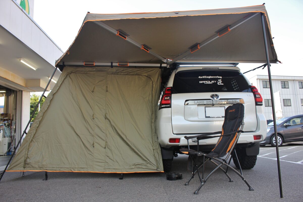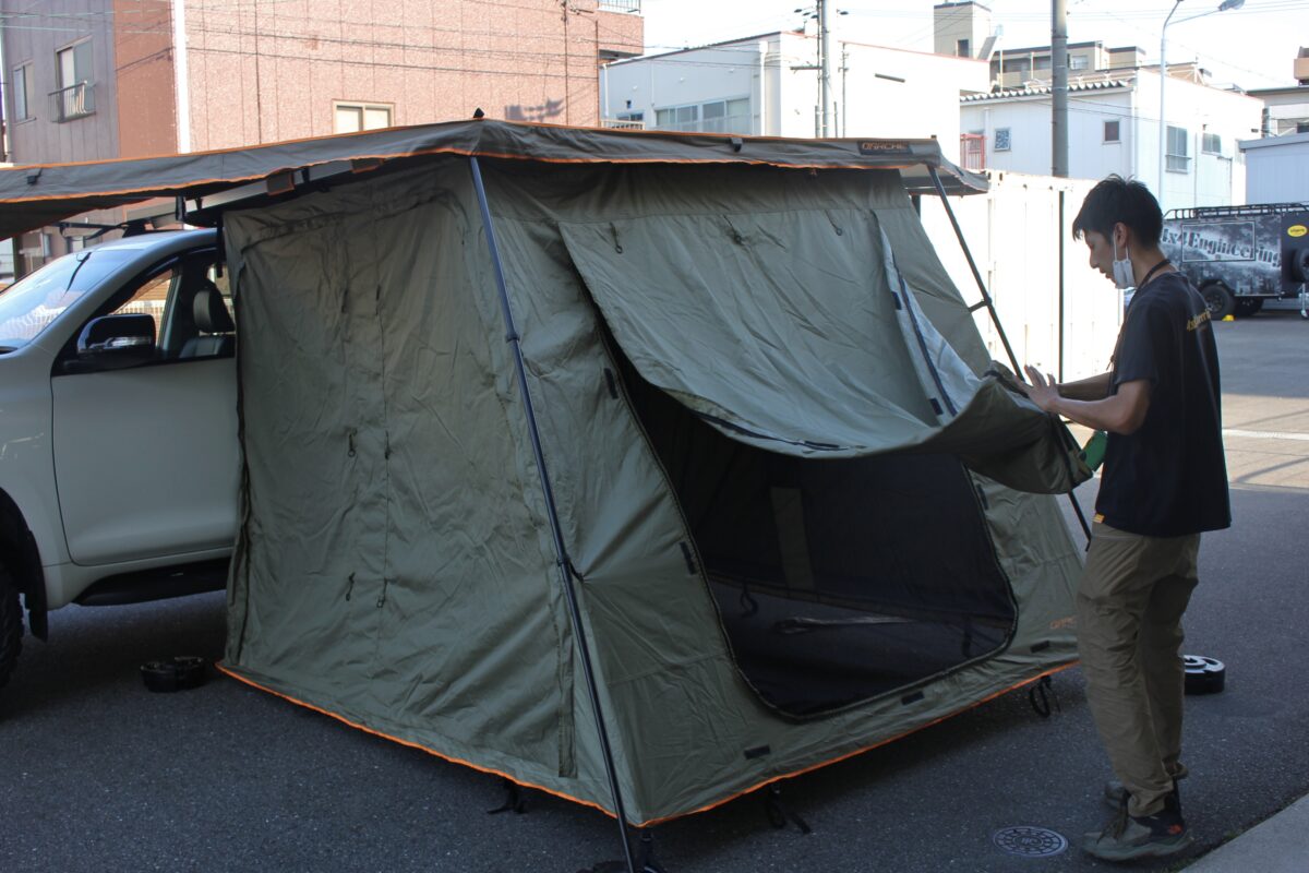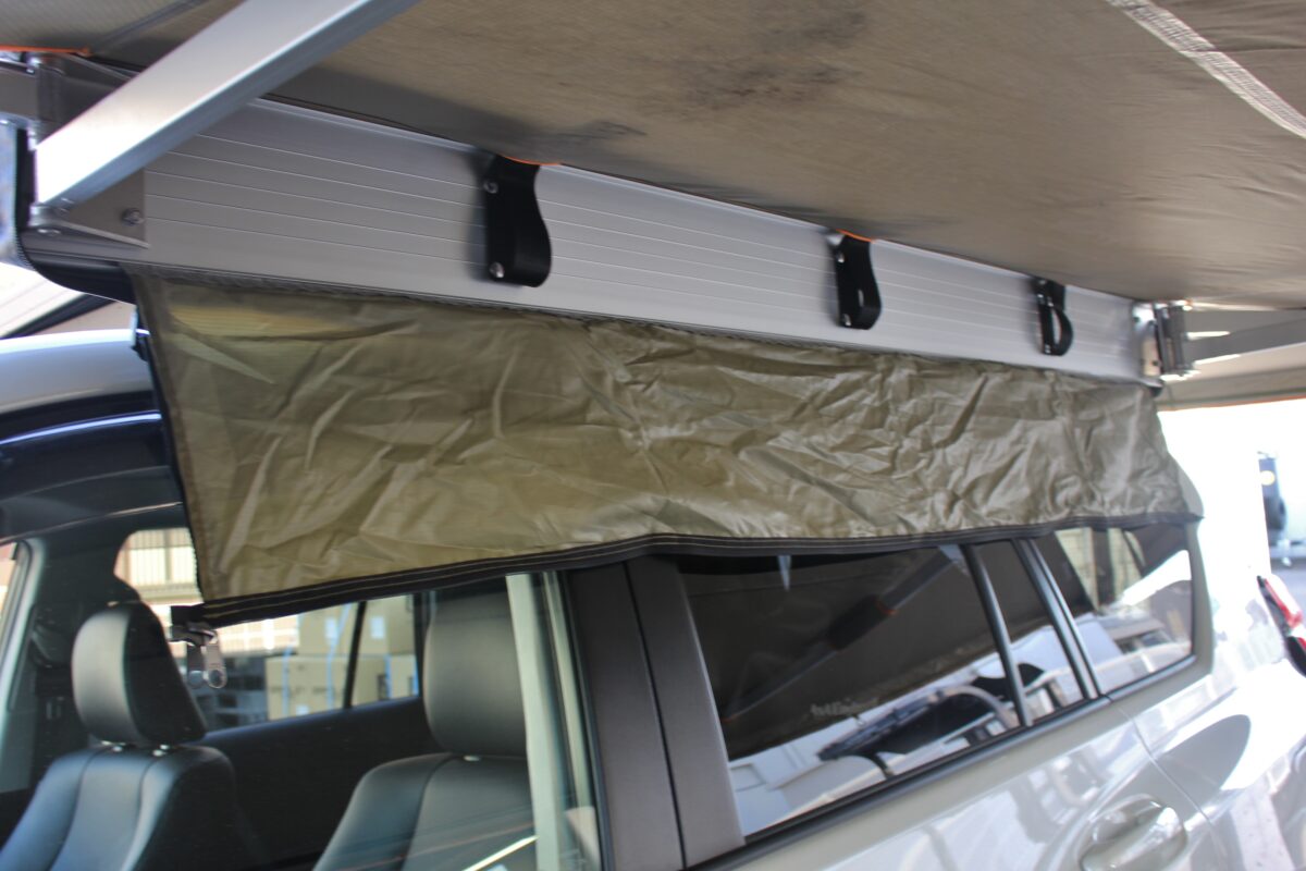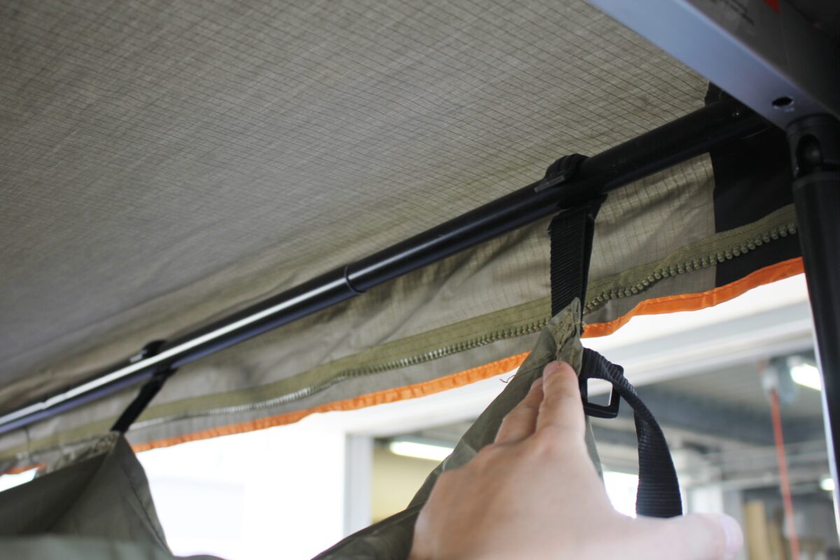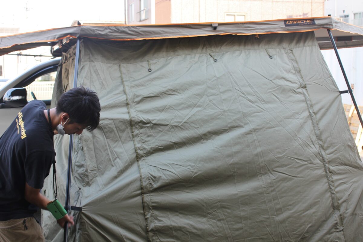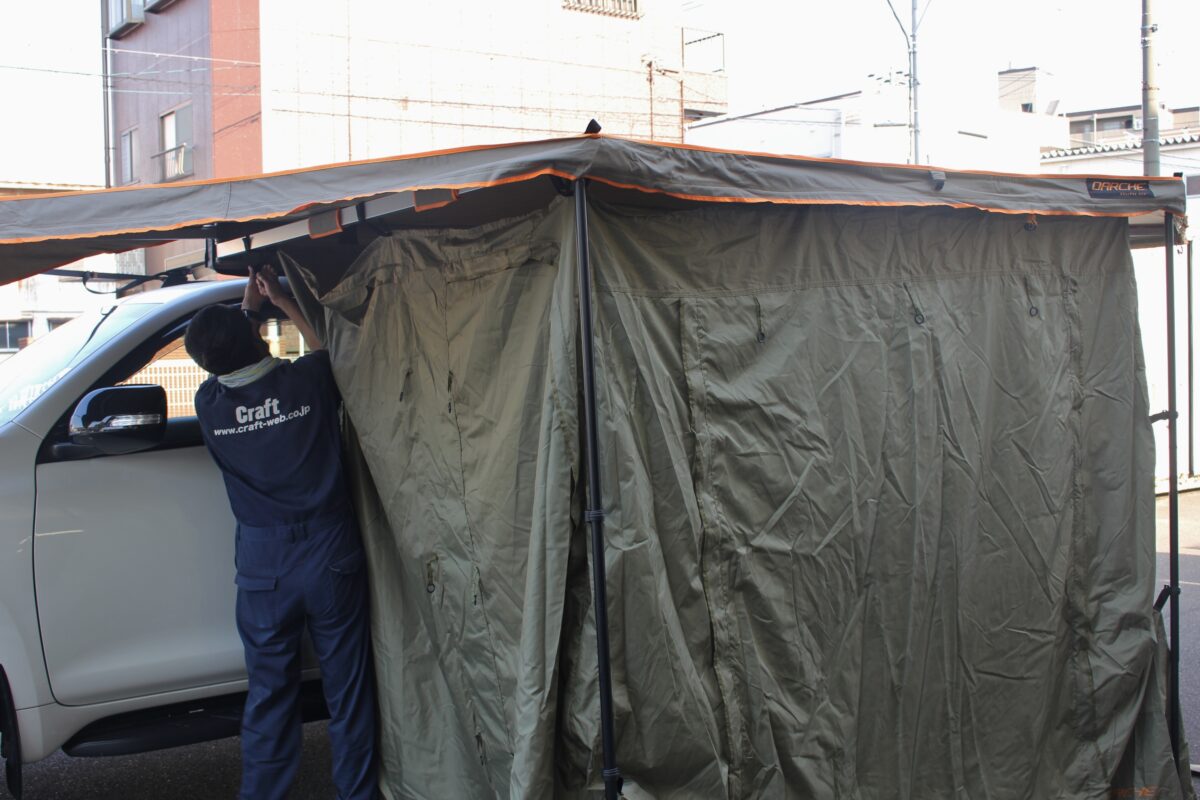 ①車側のオーニングフレームにアネックスを取り付けるチャックを装着。