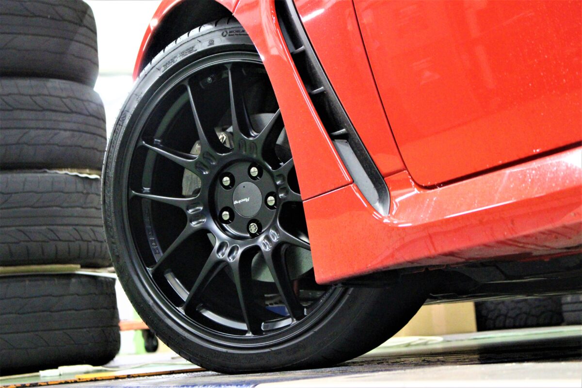 純正の215タイヤの使用も考慮し、今回は8.0Jサイズにて装着。