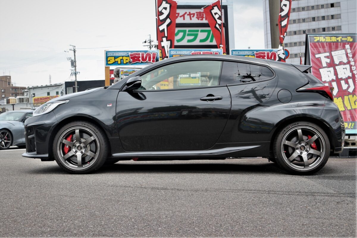 車高調でローダウンしたGRヤリス RZをCE28 N-plusで9.5Jのバッチバチツライチセッティング。