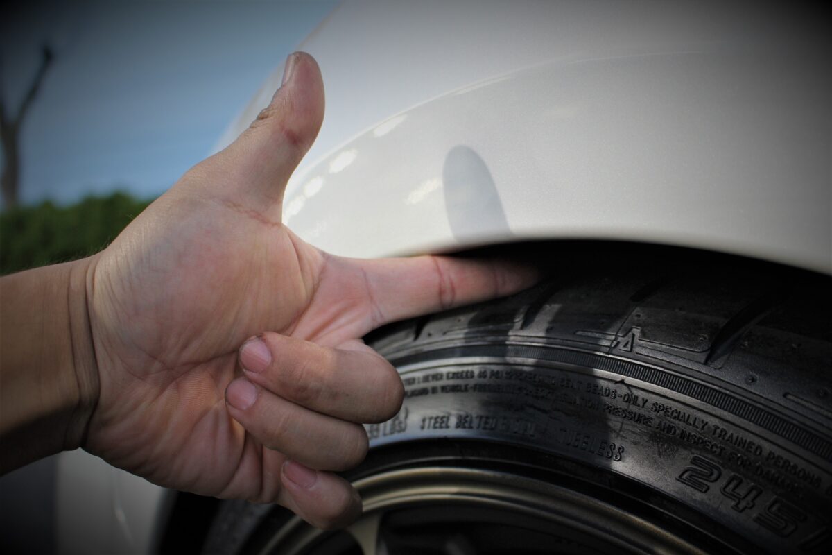 キツめのサイズを収めるために車高は低めのセットアップ。