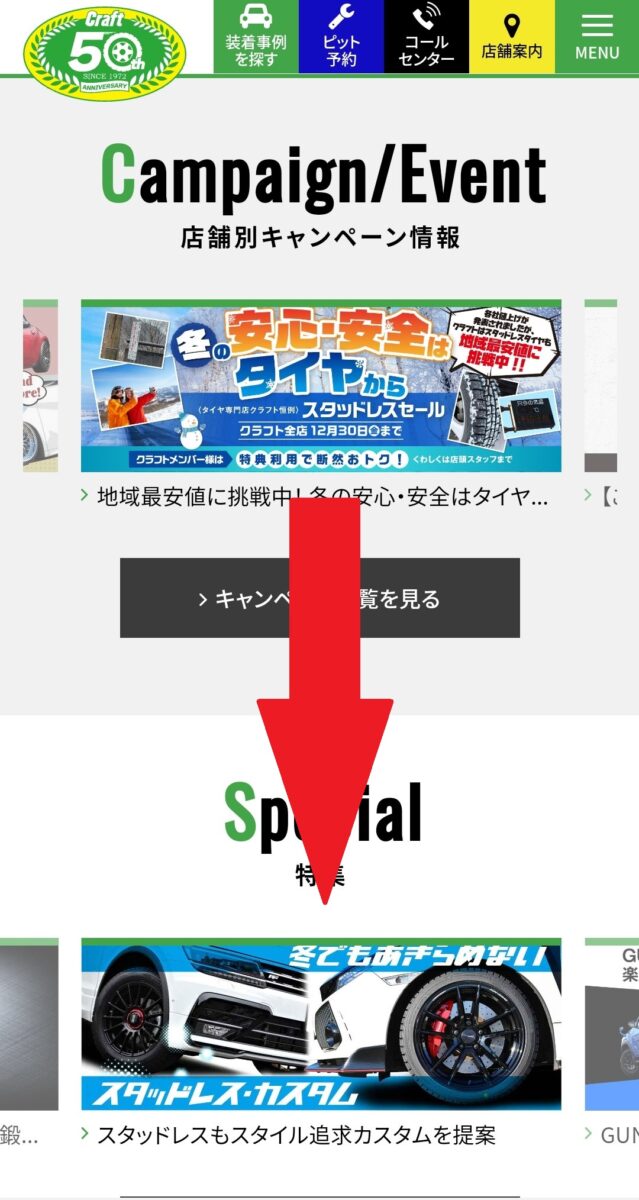 HPのトップから下の方へスクロールして行きます。