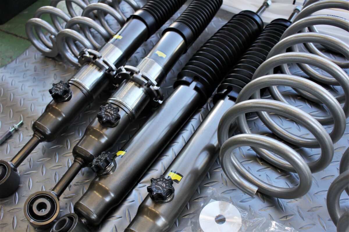フロントには車高調整機能が設けてあり、プラドの前下がりを解消できるリフトアップキット。