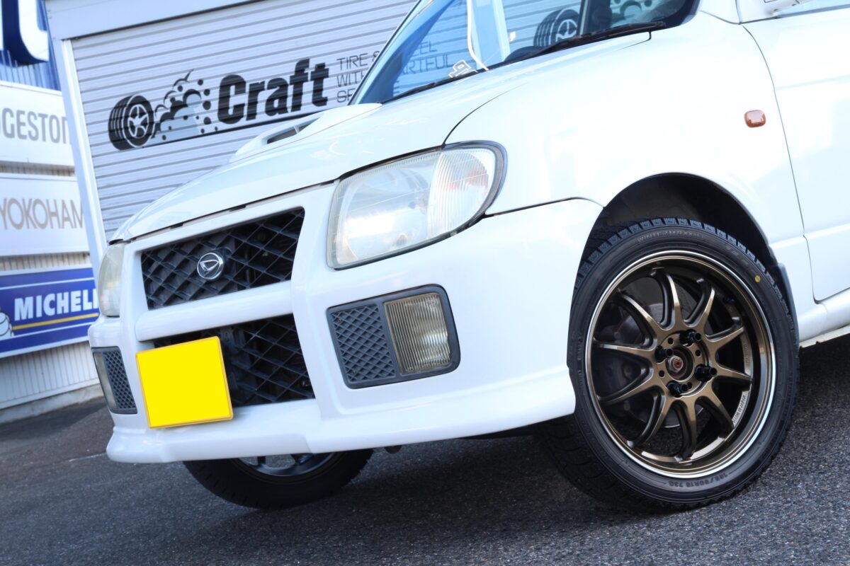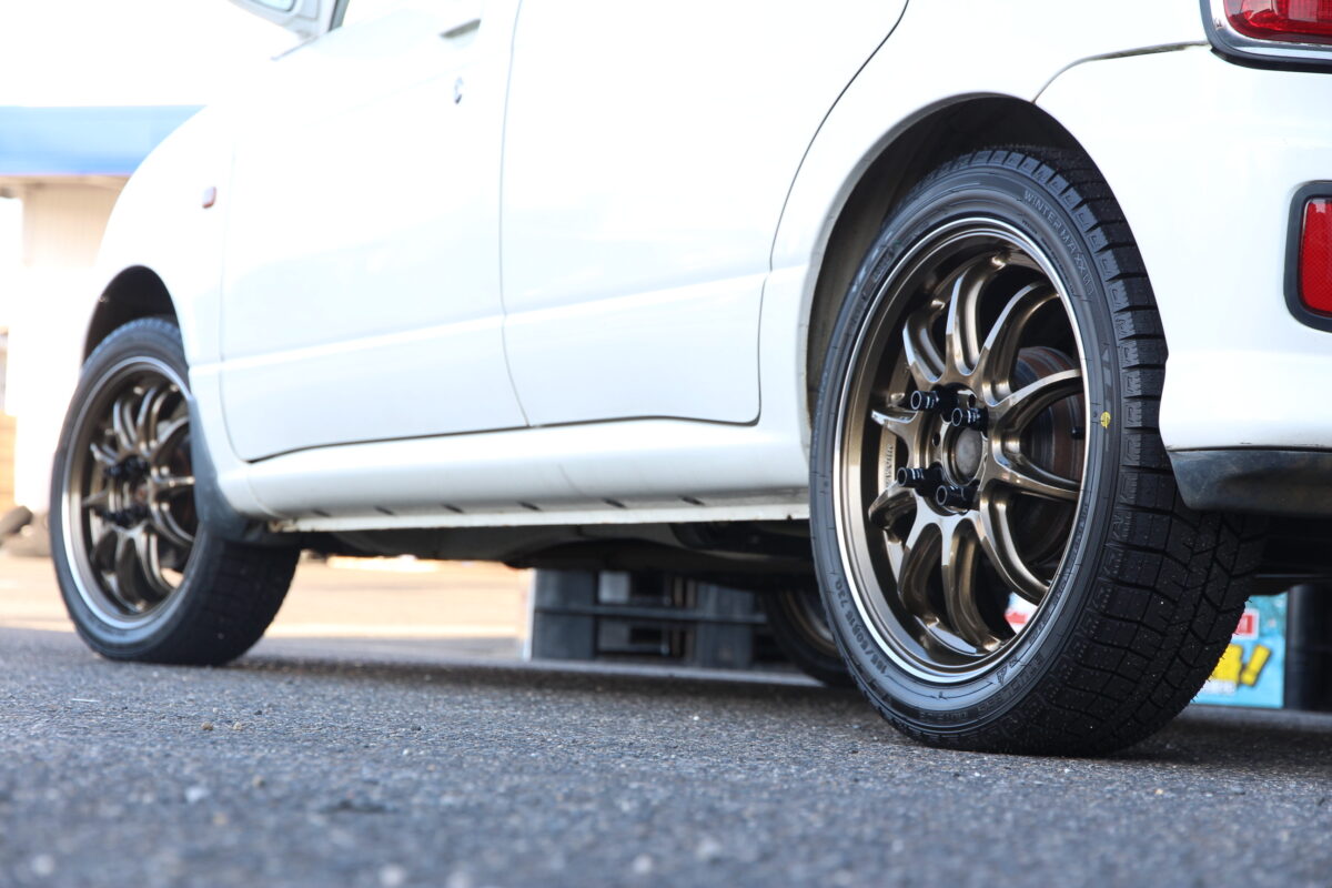 本日はスタッドレスタイヤ&コダワリのホイールを装着したミラをご紹介します