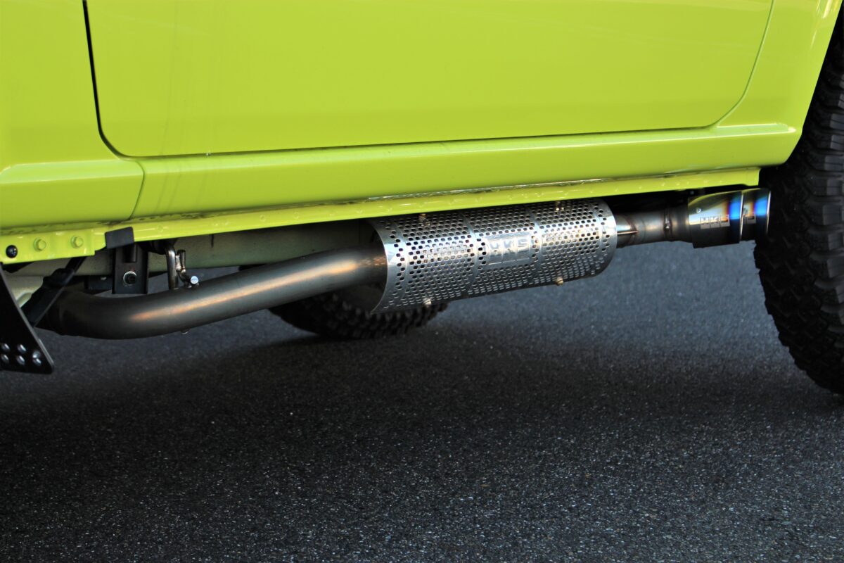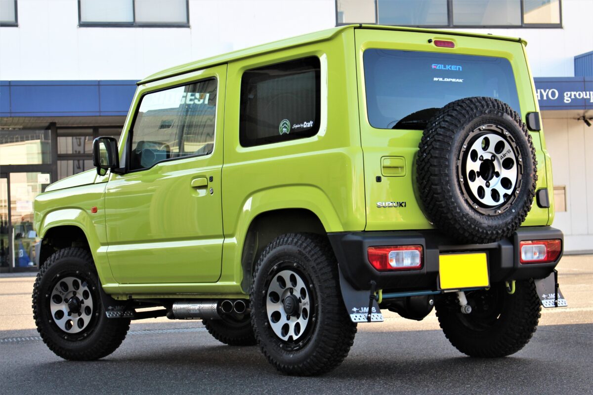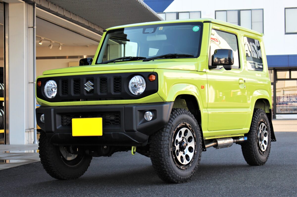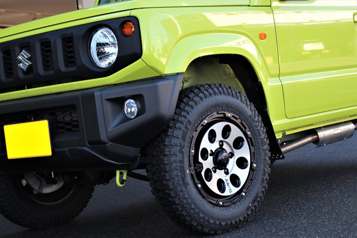 鮮やかなキネティックイエローなボディカラー、マッシヴな足元でコーデされたJB64ジムニー。