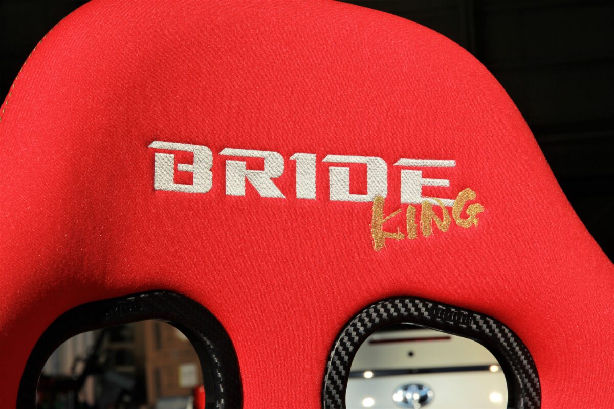 土屋氏の愛称である「KING」や「職人」といった文字が背もたれとヘッドレストに金糸で刺繍されています