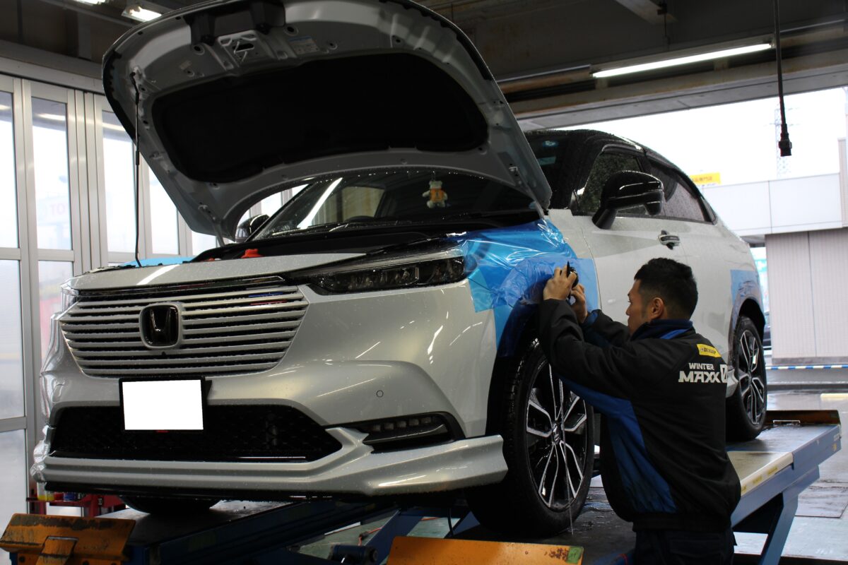 ボディに傷がつかないよう養生したうえで、作業を進めていきます。