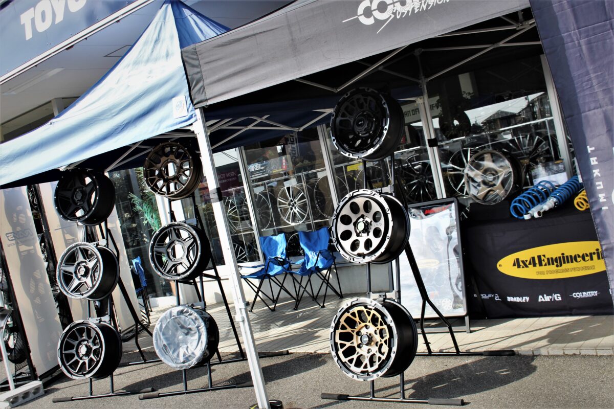 オフ系カスタムメーカーを中心にホイールやサスペンションパーツ満載の展示。