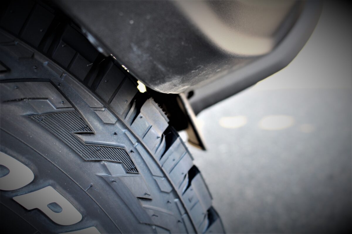 無骨な樹脂フェンダーいっぱいに広がるタイヤがステキ。