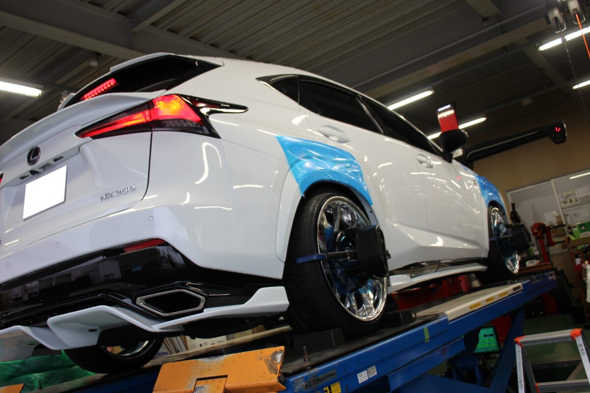 足回りはいったんばらしてのお取り付けとなるので、4輪アライメントを実施。