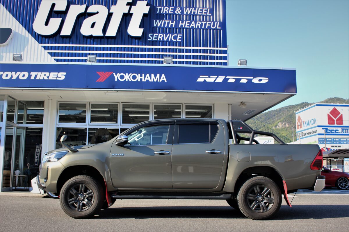 やはりハイラックスはアゲるべし!! JAOSリフトアップセット&マッドテレーンで迫力マシマシのハイラックスが完成ですっ♫♫     いつもありがとうございます、クラフト厚木店·佐藤です!!   本日のご紹介はA様・ハイラックスGRスポーツ。   ハイラックスの定番カスタム 「 リフトアップ&タイヤ・ホイール交換 」 を行いま〜す✨     まずはコチラ。   ご入庫時は見ての通りのノーマル仕様。   こうして横から見ると、どうしても前下がりに見えてしまいますよね。   ですが、これはハイラックスと言うクルマの宿命でもあります。   しかし!! 世の中には便利なカスタムパーツが発売されているんですよっ✨   そんなパーツを装着すると次の画像のように変身しちゃいま〜す♫♫     いかがでしょうか!?   ノーマル時の前下がり感もなくなり、オフ感マシマシのハイラックスに変身しましたよねっ 👍     続いて タイヤ・ホイール のご紹介です!!   ご購入いただいたホイールは 「 4×4エンジニアリング Air/G ロックス  」   光の受け方でホイールカラーが変化する ゴーストエディション をチョイス!!     ゴーストエディションとは、通常ラインアップのカラーとは違い、スモーククリア仕上げとなっています。   それにより、明るい日中と夜とでホイールカラーが違って見えるんですよっ♫♫   1つのホイールで2度楽しめる。。。   ゴーストエディションとはそんな面白いホイールカラーなんですよっ 👍     そして、一緒に組み合わせたタイヤは 「 ヨコハマ ジオランダーMT G003 」   タイヤ銘柄の後ろに書いてある MT とは マッドテレーン タイヤの事。   マッドテレーンとは悪路でのトラクション性能を1番に考えられているタイヤ!!   なのでトレッドデザインもかなりゴツゴツしたパターンとなっています。   このゴツゴツとしたタイヤパターンが見た目的にもカッコ良い事から、オフロード走行をしないオーナー様からも人気なんですよっ 👍   そして、タイヤサイズは 275/70-17 を履かせています!!   このタイヤサイズは外径を2周り程大きくしたサイズとなります。   干渉問題がつきまとうハイラックスですが、必要なリフトアップを行う事で無事に装着する事が出来るんですよぉ〜✨   ハイラックスのカスタムはぜひクラフト厚木店までご相談下さい!!     A様、この度はご利用誠にありがとうございました!!   ノーマル車高で履けるサイズにするのか。。。 それともリフトアップを行い迫力マシマシのハイラックスを作り上げるのか。。。   色々とお考えいただいた結果、リフトアップを行いながらのカスタムを選択。   その甲斐もありカッコ良い愛車に仕上がってくれましたねっ♫♫   カッコ良く仕上がった愛車でのドライブはいかがでしょうか!?   それでは楽しいCarライフをお送り下さいね、またのご利用よろしくお願いしま〜す☆☆