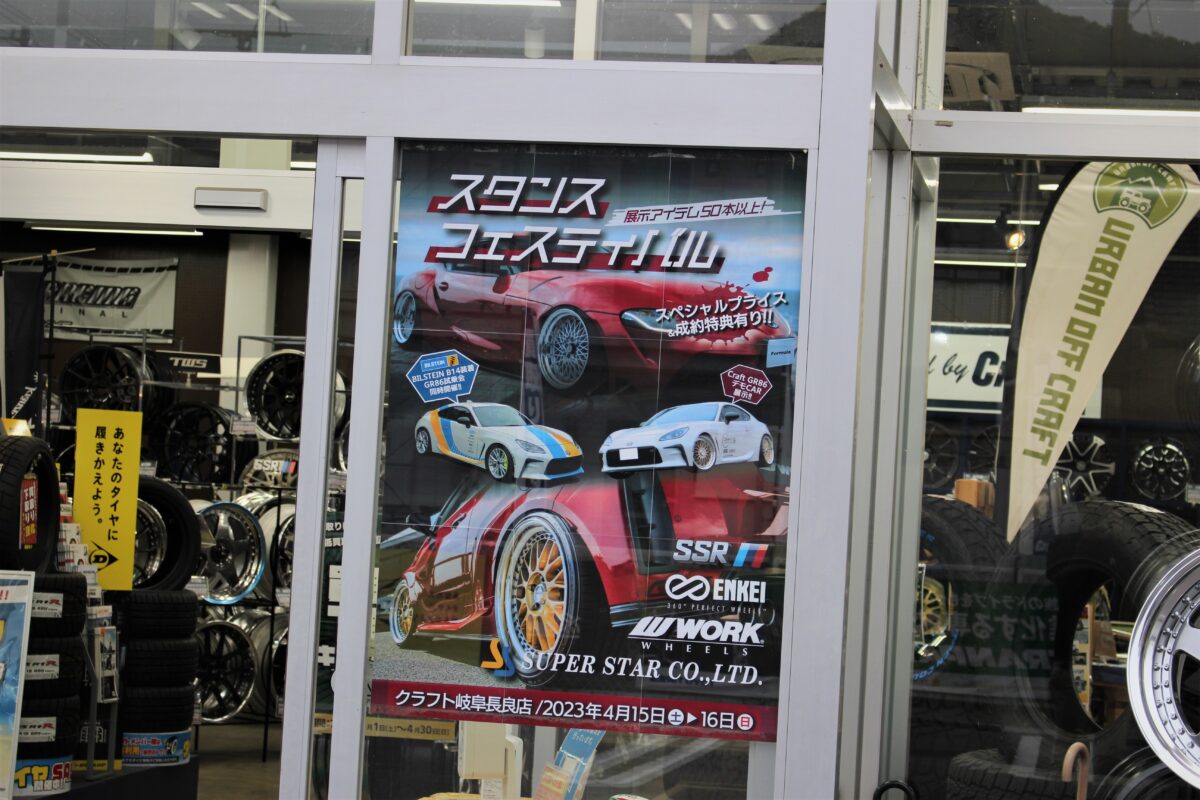 ■ 周年祭開催中!スポーツカーカスタムフェア スポーツカーカスタムフェア開催中のクラフト尾張旭店です。 デモカーがやってきました! カスタムされたGR86です^^ 今日から3/29(日)までの展示予定です♪ 車高調でローダウン。 そして人気のサンナナを装着中です。 スポーツカーにホワイトカラーのホイールは似合いますね! 逆側はブラックのサンナナ装着中! 足元をブラックで引き締めかっこいいスタイルになっています。 左右で色違いになっていますので、カラーで迷われている方はぜひ参考にしてください。 有名ブランドホイールが大集合。 TWS&RAYSの鍛造ホイール大量展示中です。 フェア期間中はご成約特典もあります^^ ぜひこの機会に! BBSホイールもフェア対象です。 LM・LM-Rは今も人気のフラッグシップモデルです。 ジュラルミン鍛造のRI-Dのサンプル品もありますよ~ アドバンレーシングも大集合! 5本スポークのアドバンGT・TC-4はとても人気です。 スポーツカーカスタムフェアは3月29日(日)までです。 たくさんのご来店お待ちしております!!