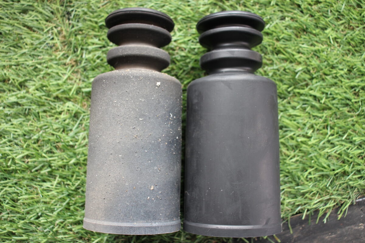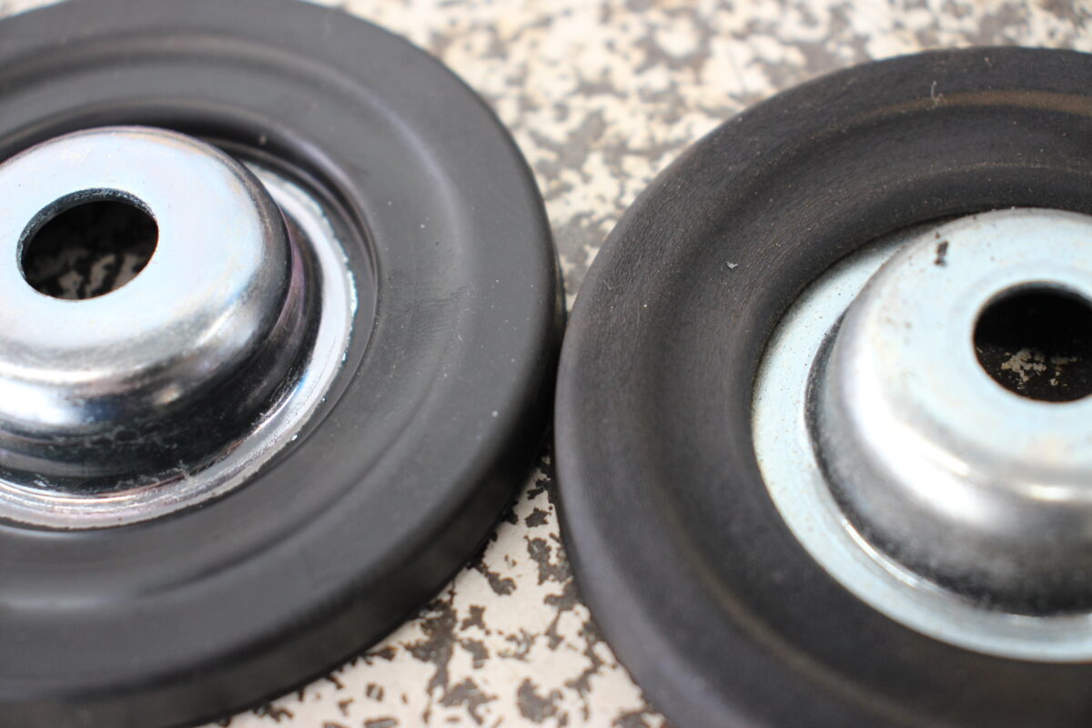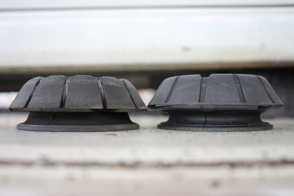 足回りをばらして外したブッシュ(左)と新品(右)を見比べてみると明らかに高さが違うのがわかります。