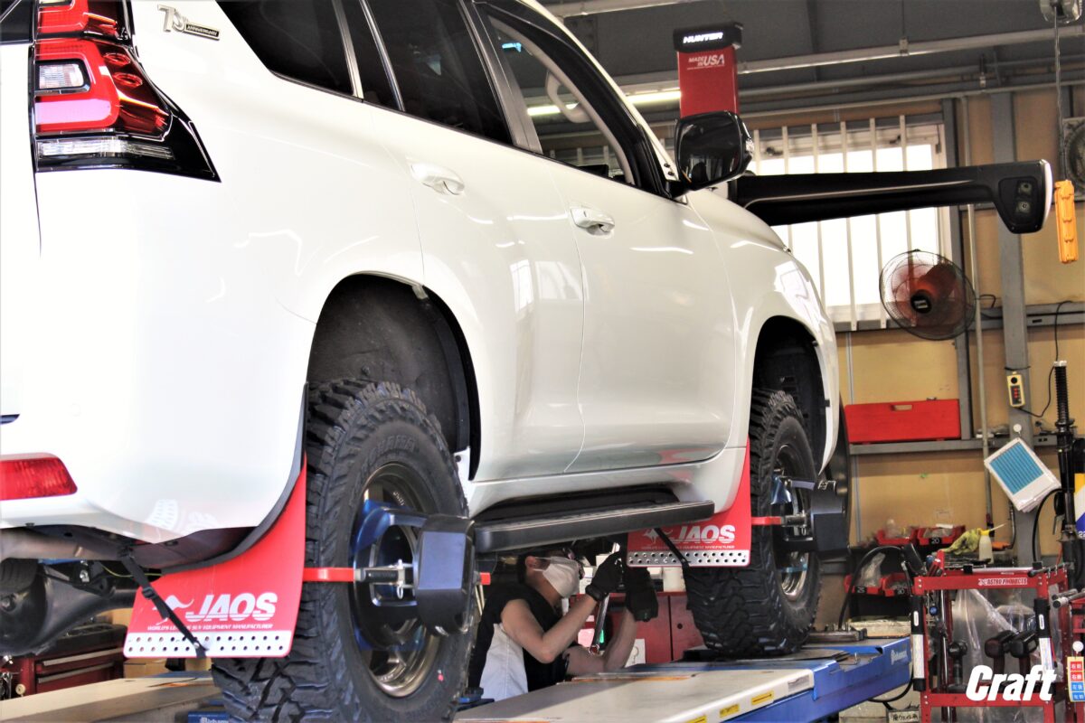 いつも通りの流れでリフトアップアイテムを装着し、仕上げのアライメント調整作業を行います!!