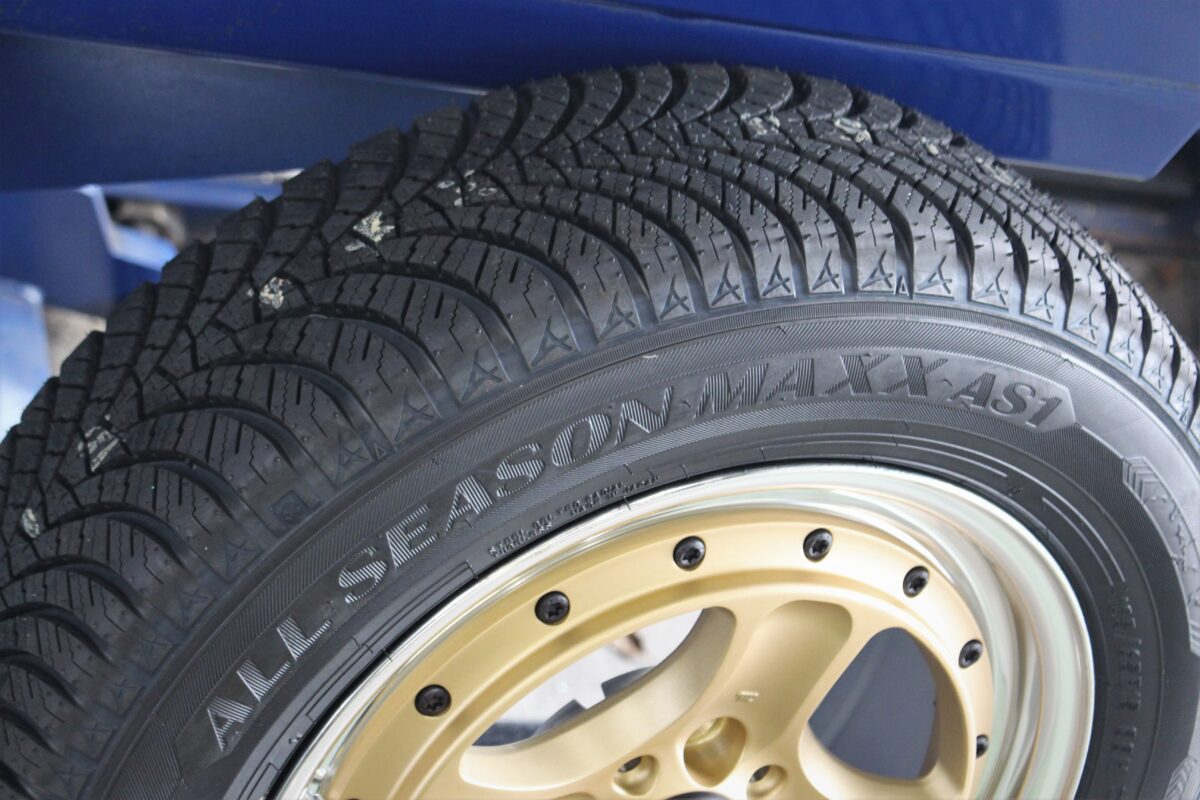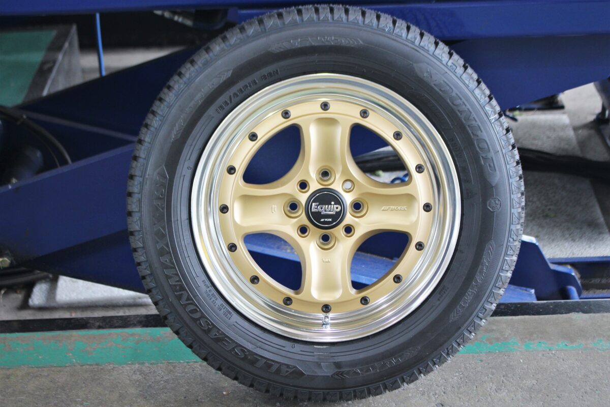 セットしたタイヤは人気のオールシーズンタイヤ!冬の出先で急な積雪!ノーマルタイヤでは走行不能ですがこれで安心です♪