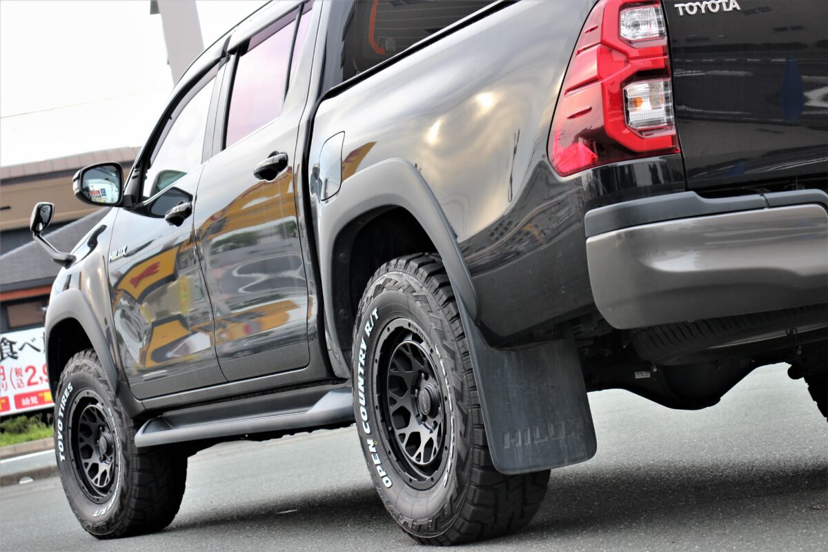 ハイラックスは 「 265/70R17 」 でも干渉するクルマ。。。 今回はJAOSマッドガードとの関係性も考慮しながら仕上げましたよぉ~✨     いつもありがとうございます、クラフト厚木店・佐藤です!!   本日のご紹介は、千葉県からお越しのT様・ハイラックスGRスポーツ。   ハイラックスと言えば、当店でもご相談が多く、今までにも多くの施工を行って参りました。   今回はその経験から得たノウハウで、オーナー様のご希望をしっかり叶える事が出来ましたよぉ~✨   それではコチラをどうぞ!!     T様からのご依頼は 「 タイヤ・ホイール交換 」 & 「 前下がりの補正(リフトアップ) 」 となります。   装着したリフトアップアイテムは 「 JAOS BATTLEZ リフトアップセット VFCA Ver.A 」 となり、車高の調整機能が備わっているモデルをチョイス。   今回オーナー様からいただいたご希望をクリアするには、この 車高調整式 と言う機能が必要だった訳です!!     上の画像はご入庫時のノーマル車高になります。   いたって普通のHILUX GR SPORTでしょうかね 👀👀   言ってしまえば、HILUX特有の前下がり感が見て取れます。。。   そして、ブレーキキャリパーとカラーを揃えたマットガードも装着しています。   今回はこの 「 マッドガードを装着している 」 と言う点に注意を払い、アイテム選びやセッティングを行いました🔧🔧     続いての画像は完成後のハイラックス。   見ての通り、車高が補正され、前下がり感もなくなっていますよねっ✨   前下がりの補正だけを考えた場合、同じくJAOSさんからリリースされているリフトアップコイルでもOK。   ですが、今回はタイヤサイズアップとそれに伴うマッドガードへの干渉も考え VFCA Ver.A を装着したんですよね。。。     まず、ハイラックスはタイヤサイズを大きくするとすぐに干渉問題が発生するおクルマ。   なので、どの位のリフトアップ量に仕上げるのかがとても重要!!   GRスポーツの場合、純正タイヤサイズが 265/60R18 となりますが、265/65R18 や 265/70R17 と言ったワンサイズアップ程度でも干渉問題がつきまとうんですよね。。。   しかも、ノーマル車高ではなく、リフトアップを行っていたとしてもです。汗     リフトアップを行っていないならともかく、リフトアップを行っているのに 「 ワンサイズアップ 」 も出来ないなんて、何だか残念ですよね。。。   ちなみに、干渉問題が発生するのは 「 フロント 」 のみとなり、更にはハンドルを切った時に限定されます。   そんなおクルマだからこそ、JAOSさんからインナーフェンダー加工KITが商品化されているんでしょうね 👀   それでは、HILUXはタイヤサイズを大きく出来ないのか??ってところですよね。   答えは 「 NO 」 です!!     当店でも 「 265/70R17 」 と言う定番サイズを筆頭に 「 275/70R17 」 や 「 285/70R17 」 などの2~3サイズアップまでのサイズはご要望も多く、多くの装着事例があります 👍   ですが、今回はJAOSマッドガードを装着しており、その部分の干渉を避けたいと言うご要望を加味しながらアイテムをチョイス!!   まずリフトアップアイテムに VFCA Ver.A をチョイスしたのは干渉を防ぐために 2.5インチ 程のリフトアップを行う必要があった為。   ちなみに、この仕様(リフトアップ量)の事を当店では 「 ちょいアゲ仕様 」 と呼んでいます。笑   ちょいアゲと言っても少し上がる訳ではなく、迫力の仕上がりとなりますよぉ~✨   そしてハンドルを切った際の干渉を抑える為に 「 265/70R17 」 と言うタイヤサイズをチョイス👍   この組み合わせにより、施工後もタイヤとマッドガードの干渉を抑える事も出来、オーナー様のご希望を叶える事に成功したと言う訳です。   そしてもう1つの拘りが出ヅラになります👀👀     上の画像のように、しっかりリフトアップを行った事で、タイヤサイズを大きくしながらもマッドガードへの干渉は回避。   そして最終ミッションはハイラックスGRスポーツのワイドフェンダーにマッチするホイールサイズの提案です!!   本日装着の RAYS DAYTONA D325 は見ての通り、オフ感漂うアイテム。   ですが、その良い雰囲気も出ヅラ次第では良さを引き出しきれないんですよね。。。   そんな訳でホイールサイズにも拘って仕上げた出ヅラがコチラ!!     前後ともに、キレイな出ヅラへと仕上がっていますよね!?   タイヤのサイドウォール部でギリギリの出ヅラ、これぞツライチと言った仕上がりっ 👍   特にHILUXは1ナンバー(普通貨物)の登録の為、プラドやランクル250などの普通乗用車とは基準が違います。   要は 「 タイヤ(ゴム部)の突出も許されない 」 クルマなんですよね。。。汗   そんな事から、今回のカスタムはリフトアップ量の計算や干渉を抑える為のタイヤサイズ、更には出ヅラと言った多くの計算が必要となるカスタム事案だった訳です。   そんなちょっと高度なミッションでしたが、当店で行ってきた多くの施工事例から得たノウハウで無事施工完了っ👍   これから愛