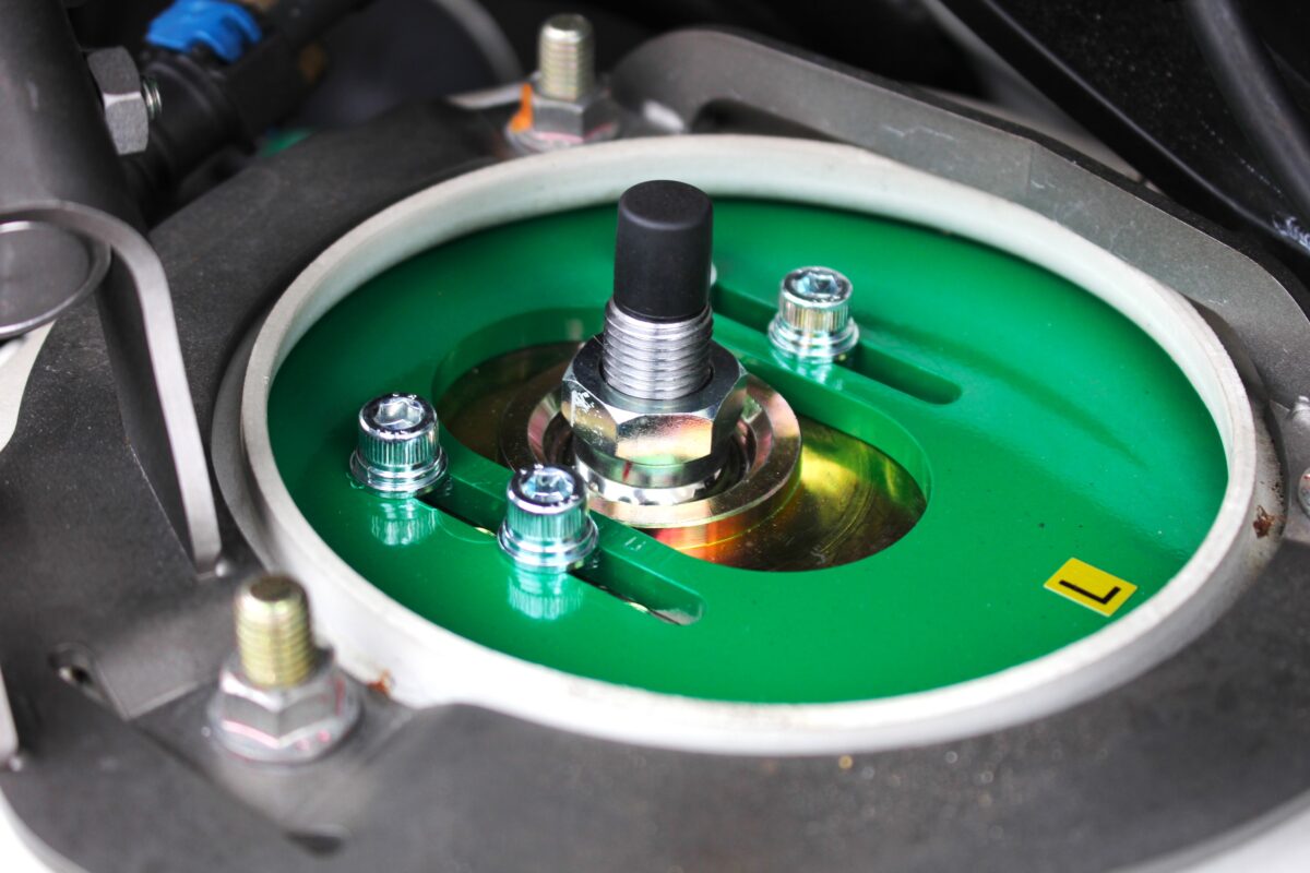 フロントアッパーマウントはピロ式が採用されており、さらにスライドアッパーでキャンバー調整付き。