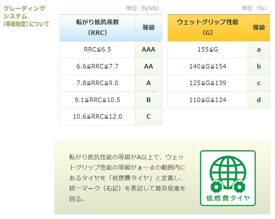 低燃費タイヤとは、転がり抵抗性能がA以上、ウェットグリップ性能がd以上のタイヤのことを指します。