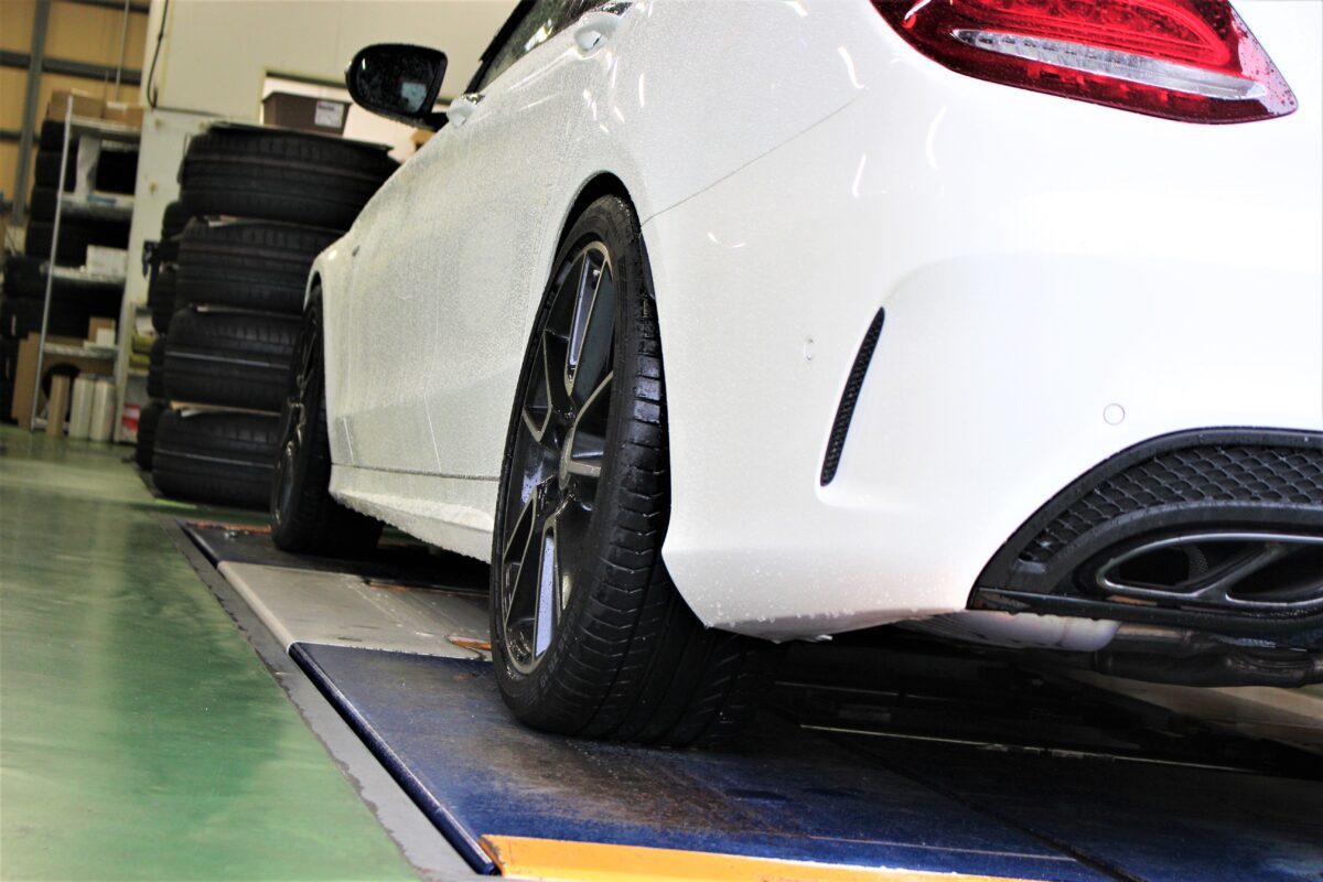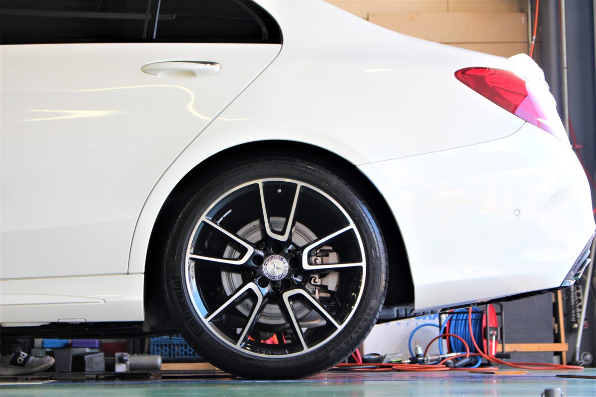 輸入車のローダウン施工が多い当店。特にメルセデス系のお車は