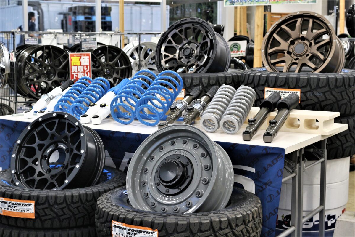 サスペンションの展示を囲むようにオフロードタイヤ&ホイールも展示しています。