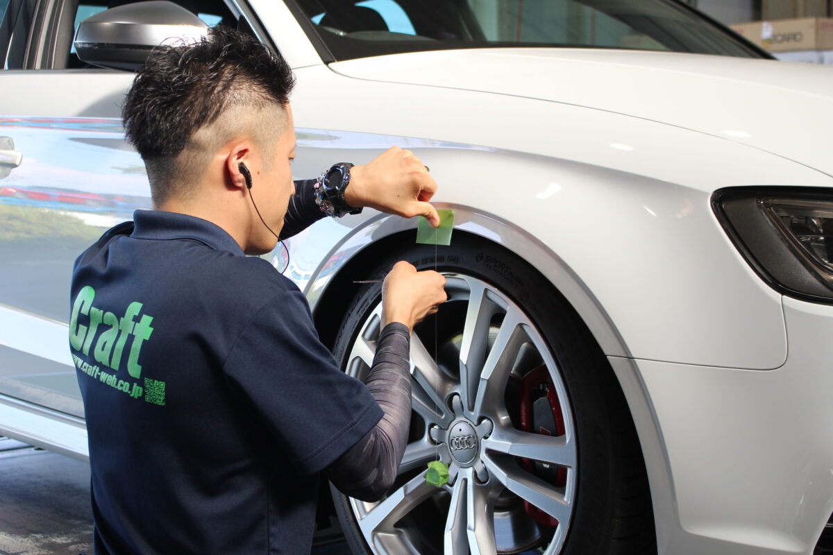 ■新型アウディA8 55TFSI クワトロのホイール交換-前編-。   こんにちは!クラフト中川店の安藤です。 セダン・ミニバン・スポーツカー…etc様々なジャンルのご入庫もある当店。 勿論、インポートカーもお任せください(*^^)v 当店初入庫となるのは、最新モデルのアウディA8。4代目にあたるD5型が入庫です(^-^) 全長5.17mのロングボディに19インチ標準装着で迫力満載。 当店常連様が車両入替に伴い、ホイール交換のご相談を頂きました。 前車210クラウンでは、ハイパークローム系のホイールを装着されていましたが、 今回は方向性を変えてシンプル路線がご希望のオーナー様。 数多くのホイール候補がありましたので、まずはリアルマッチングからスタート。 ホイールの質感を楽しむべく、ブラッシュド系に候補を絞り込みマッチング。 また、純正19インチからインチアップの際、20・21インチとそれぞれボディフォルムに 合わせて具体的なイメージを描く必要があります。 最終的にインチは21インチ。そしてディスクタイプの選定幅があるモデル。 特殊P.C.D対応モデル…etc行き着いた答えが、国産3Pモデルを有するSUPER STAR。 5スポークベースの細身なスポークデザインで大口径感も得られるレオンハルト シュタインに決定。 この他、ホイールカスタムの幅を多く持たせられる点も決定打でした(^-^) まずは、純正ホイールからアウター・インナークリアランスを測定し、 おおよそのサイズを割り出していきます。この時にハンドル旋回時の距離感なども合わせて確認。 フロントに収まる6potブレーキキット。この箇所をクリアできるのかがキモです。 3P系ホイールですので、ディスクタイプを選定しなければいけません。 といってもメーカー様に装着データもありませんでしたので、当店お馴染みの方法でいきます。 メーカー様からホイール型紙を手配。 SUPER LOW・LOW・HIGHとそれぞれのディスク型紙を用意し、 実車にてクリアランス確認へ。 OK! ディスクタイプはヒミツですが、スタッフ2名以上でクリアランスを確認しディスクタイプ決定! 合わせて行った実車計測の結果、前後差もあまりなく、クワトロの性質も考慮しながら サイズも決定。 また、リアの4WS機能によるリアインナークリアランスも見逃してはいけませんネ。 全ての事項を交え、絞り出したのが前後10Jといったサイズ。 迫力あるサイズをインストールできるのもフラッグシップモデルならでは??   気になる全貌は次回のブログにてお披露目です。お楽しみに!   クラフト中川店でした!