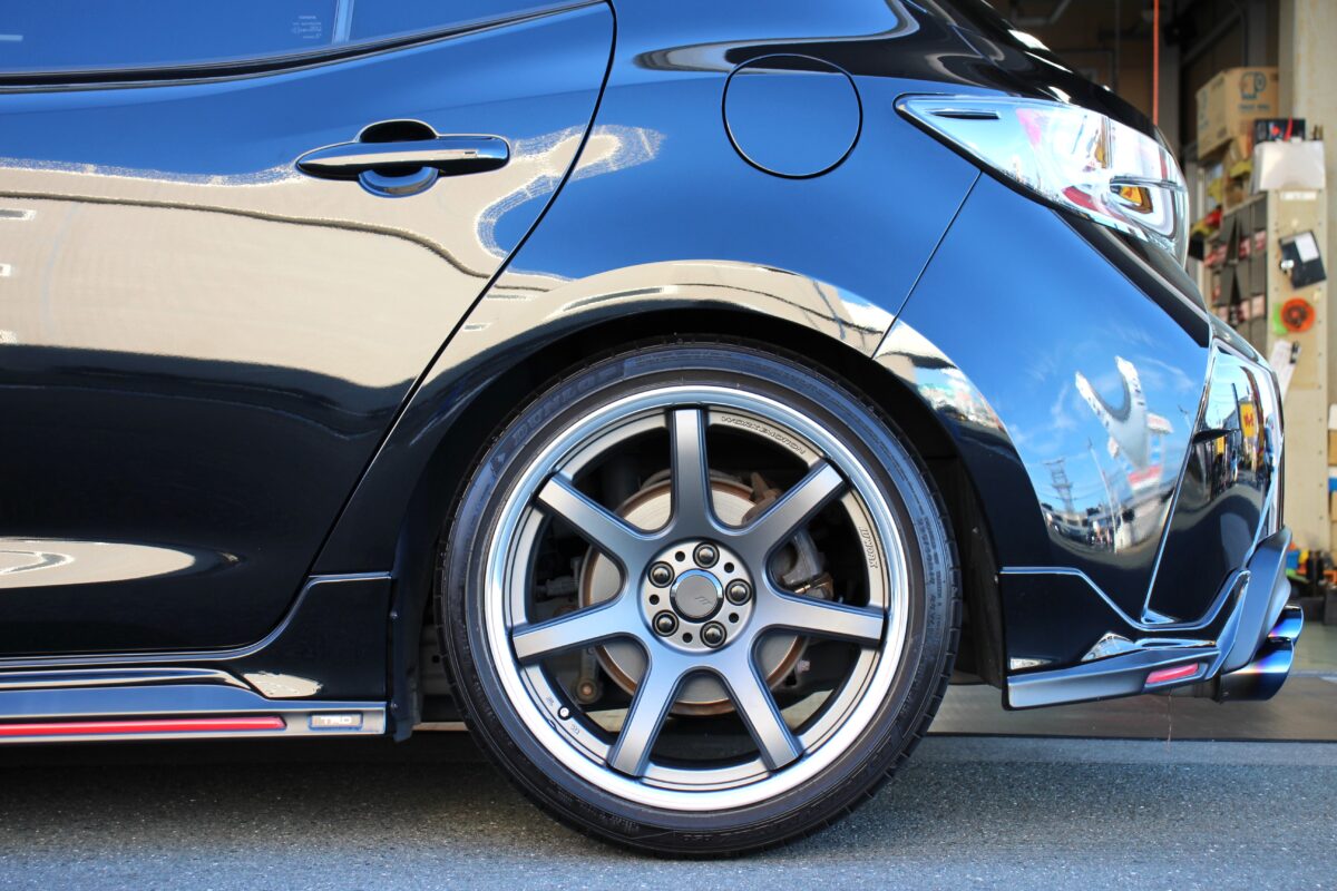 お車の構造にもよりますが、今回のお車はローダウンを行う事で取り付けできるサイズのバリエーションが増えるので