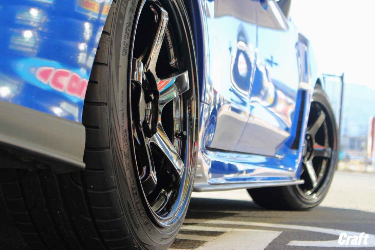 このスポークの反りに憧れて。。。 ” 9.5J スーパーGTRデザイン ” にチャレンジした結果はいかに!?     いつもありがとうございます、クラフト厚木店・佐藤です!!   本日のご紹介はO様・シビック ハッチバック FL1。   ありがたい事に、千葉県から足繫くお越しいただいているオーナー様です。   そして、当店でご購入いただいたホイールはすでに3セット、いや4セット。。。   今となってはしっかりデータを見返さないと正確な本数は答えられないくらい何度もご利用いただいているオーナー様ですっ✨   当店にはそんな形で何度もご利用いただいているカスタム好きなオーナー様が多くいらっしゃるんですよね。   これはもう、本当にありがたい事。。。   そんな皆様、これからもクラフト厚木店をよろしくお願いしますねっ♬♬     さて、O様からご依頼いただいたミッションは 「 9.5Jを履き、更なる進化を遂げたい 」 と言うもの。   ちなみに今まで装着していたホイールは 「9.0J-18インチ」となります。 このサイズ感でもなかなか攻めているようにも感じますが。。。笑   確かに、従来のホンダ車とは違い、シビックHB FL1 は装着出来るホイールサイズの幅が広がったおクルマでもあります。   前置きが長くなってしまいましたが。。 「 ポン付け 」 とは行きませんでしたが、カッコ良く仕上がったシビックをぜひご覧くださ~い✨     今回、O様・シビックを進化させる為にご準備したホイールは 「 ADVAN Racing RSⅢ 」 となります!!   そして、装着しているホイールサイズは ” 9.5J-18インチ ” と、かなり攻めたサイズ 👀   シビック ハッチバック に9.5Jって履けるんだ。。。   そう思った方も多いのではないでしょうか!?     確かに履けます、いや 「 なんとか履けました。。」 っと言ったところでしょうかね。   これまでの数枚の写真を見ていただいた事で、お気付きの点がありますよね!?   そうです、フェンダーエクステンション を装着しています。     まず、シビックHB FL1 に9.5Jを履かせる為には、上の画像のよう ローダウン を行う必要があります。   そして、ダウンサスでのライトなローダウンではなく、車高調でのしっかりとしたローダウンが必要!!   その理由は少しでもキャンバー角を寝かせ、クリアランスを確保する必要があるからです。   ここで言うクリアランスとは ” ホイールをどこまで外に出せるか ” と言う、出ヅラに関してのクリアランスとなります。   何せ、装着しようとしていたホイールは 9.5J と言う攻めたサイズでしたからね。。。     最近のクルマはローダウンを行うとキャンバー角に変化が生じるクルマが多いですよね!?   もちろんシビックHBもキャンバー角に変化が生じるおクルマ。   ですが、そのキャンバー角について、シビックHBに関してはある部分に課題が残るんです。。。   それは フロント にあります!!   もちろん、ローダウンを行う事でフロントのキャンバー角に変化は生じます。   ですが、良く使われている ストラット式 の足廻りではなく、形状がちょっと特殊なんです。   なので 「 もう少し寝かせたい。。」っと言った際に装着する キャンバーボルト が装着出来ない形状となっています。   そんな事からキャンバー角の微調整が効かないと言う条件のもと、話を進めていかなくてはいけませんでした。。。     それでもこの スーパーGTRデザインと言う迫力のコンケイブフェイス は諦めたくない。。。   そんなオーナー様の更なる進化へ向けた強い意気込みもあり、フェンダーエクステンションを装着しながらこの迫力の 9.5J 仕様にチャレンジする事になったと言う訳ですっ👍   ですが、この極太のリム幅にチャレンジする為に、他にもチェックしなければいけない点があったんです 👀   それは インナークリアランス です!!     装着出来るかどうか、そんな流れで出ヅラの確認は誰でもするでしょう。。。   ですが、シビックと言うボディーサイズである事から、車体側のクリアランスがそれ程残っていないんですよね。汗   残っていないとはどう言う事か??   それは 「 ホイールの内側と足廻りが干渉する可能性が高い 」 と言う事です!!     9.5J と言う太いホイールサイズを装着すると、ボディー外側もギリギリいっぱいな仕上がりとなりますが、ホイールが広がるのは外側だけではないと言う事!!   要は、ホイールの内側もボディーに向かって広がっていく訳です。。。   そんな事から外側ばかりに気を取られていると、ホイールを装着した際に車高調とホイールのインナーリムが干渉する恐れもありました。   今回のチャレンジではそんな部分もケアしながらホイールサイズを選ばなければいけませんでした。     ボディーから突出しないサイズを選びたい。。。 それでいて、インナー側にも広がらないサイズを選ばなくてはいけない。。。   そんな問題を解決するために行ったのが 「 実車計測 」 と言う採寸作業。   その計測を行う事で