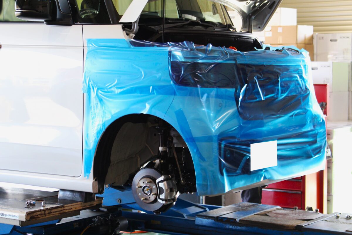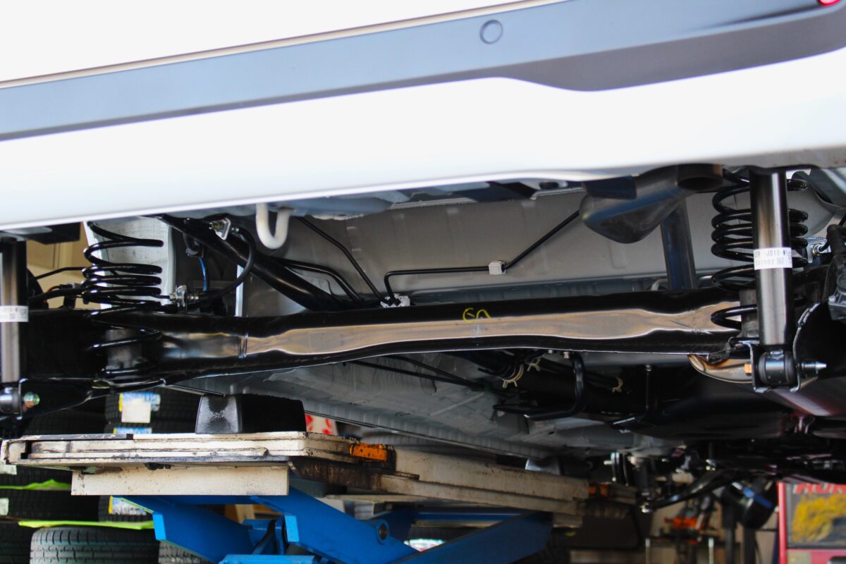 各部養生を行いつつノーマル状態の車高を前後確認し作業START!