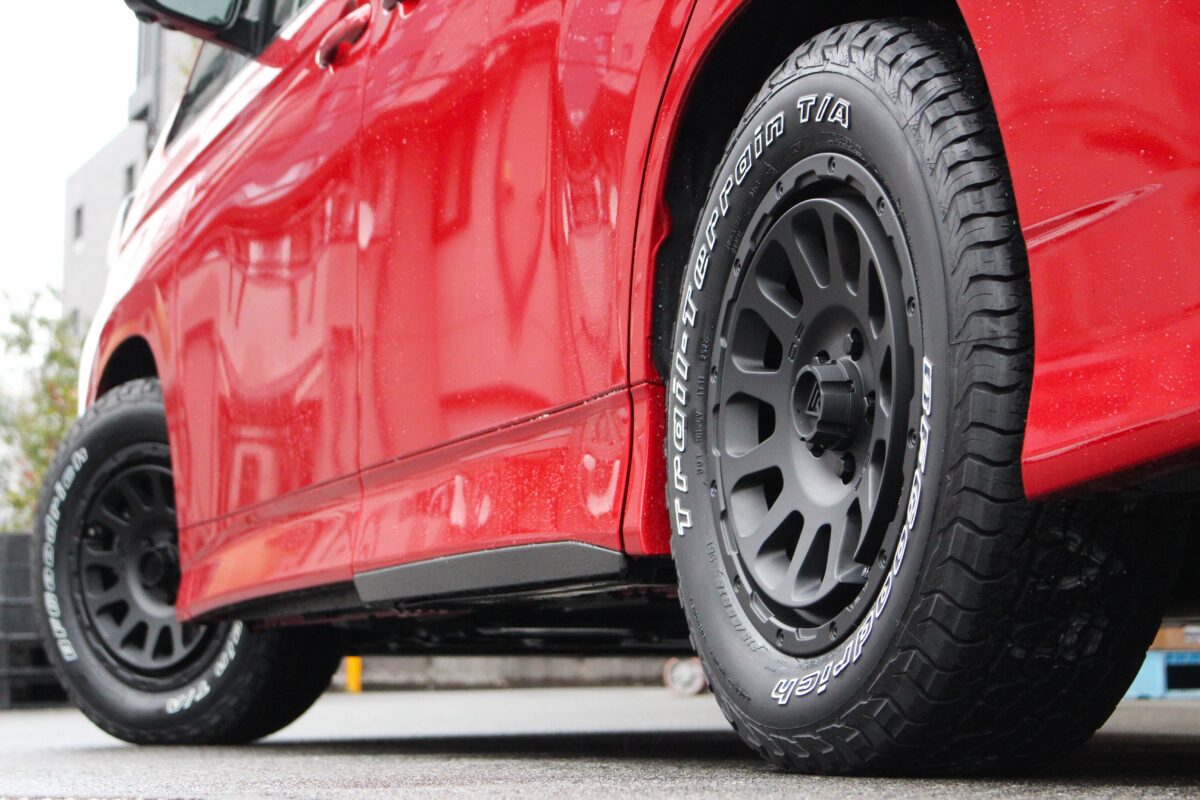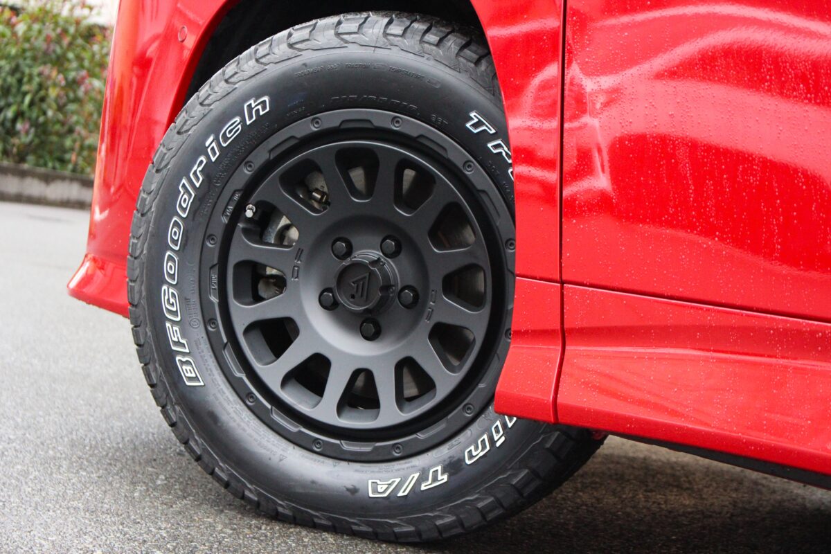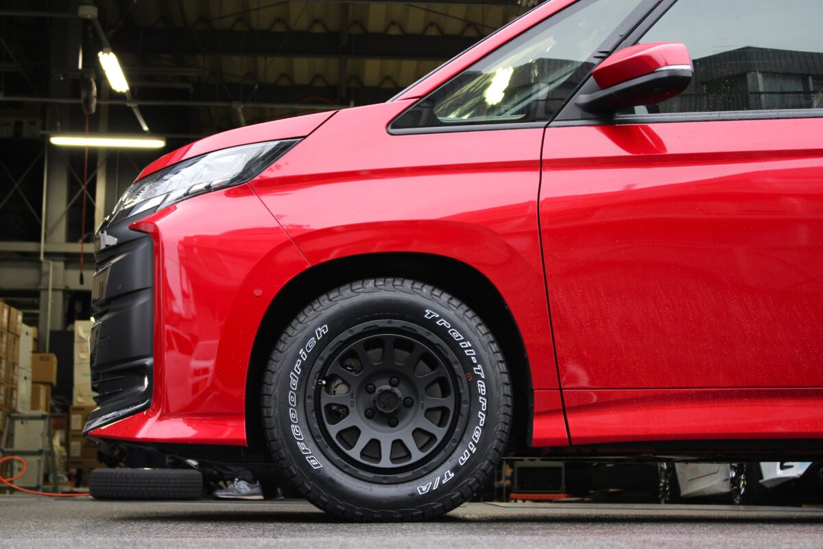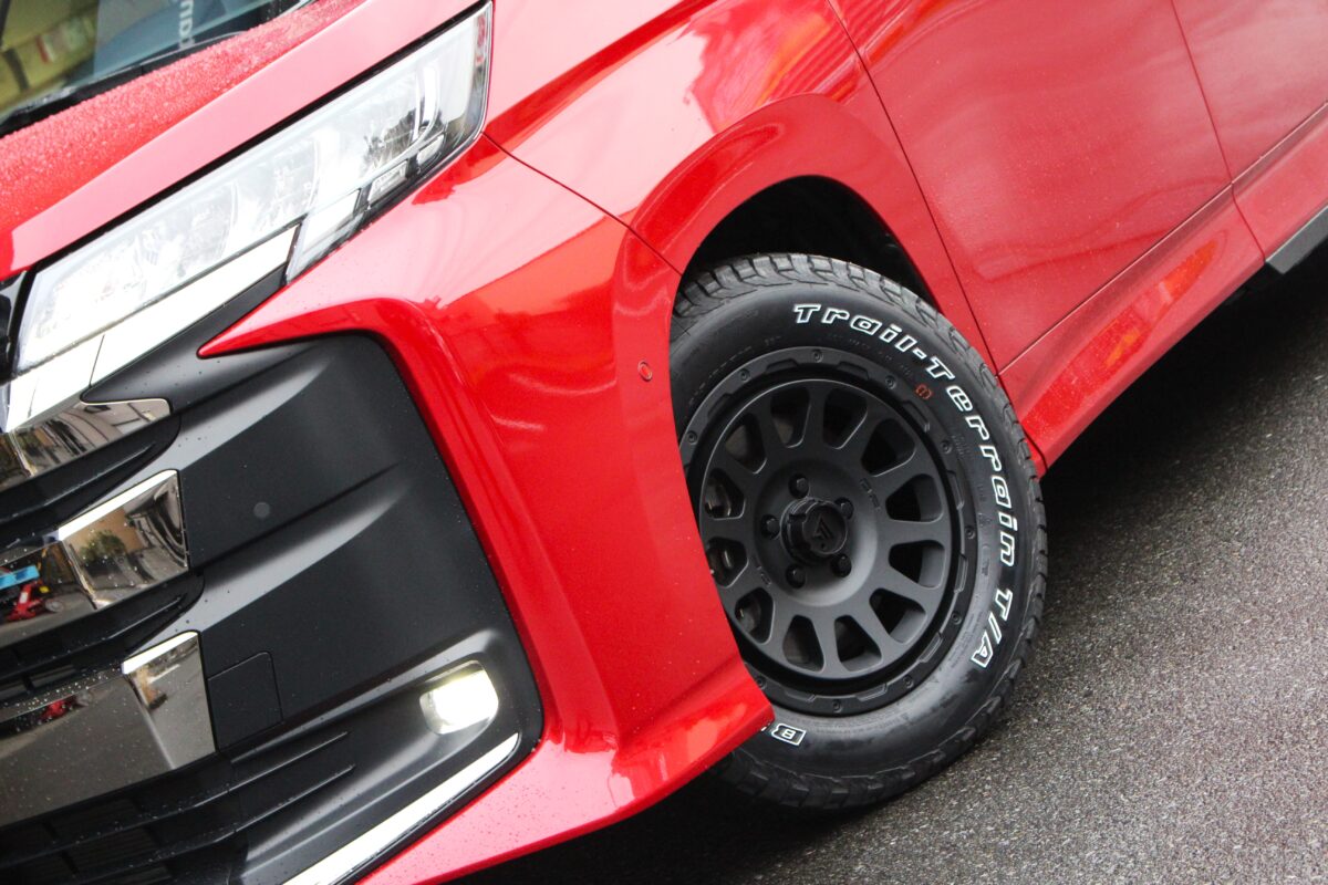 今回はボディ色のレッドとブラックでの統一をコンセプトにホイールを選んでいただきました。