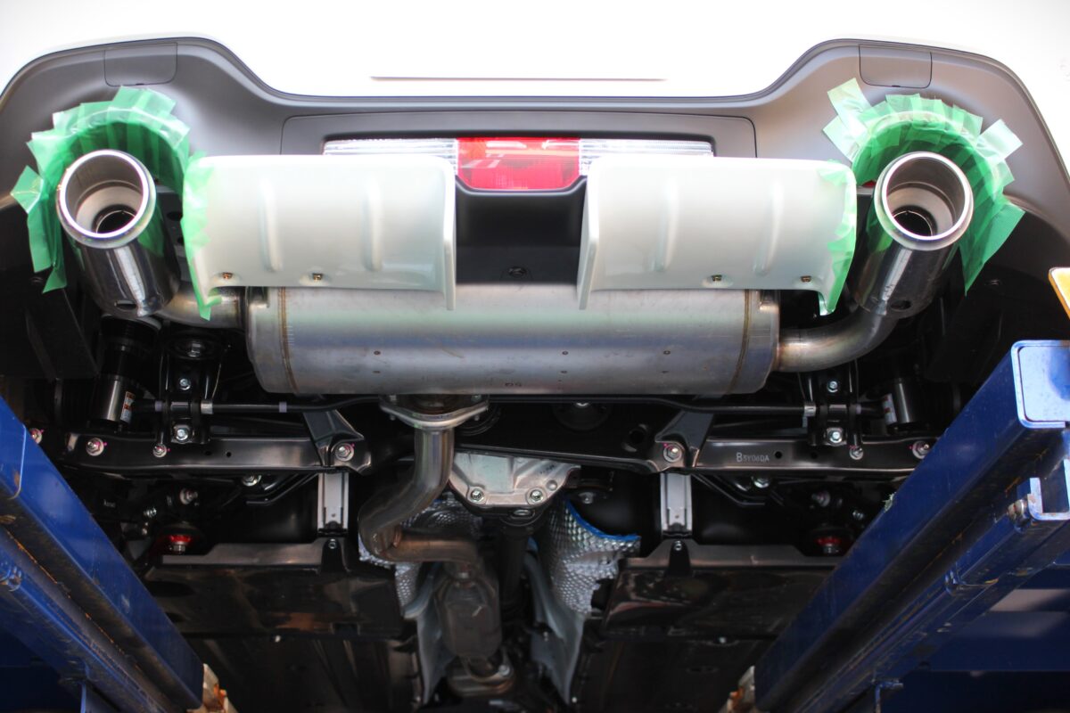 バンパー周辺の養生を行い、純正マフラーを取り外していきます!
