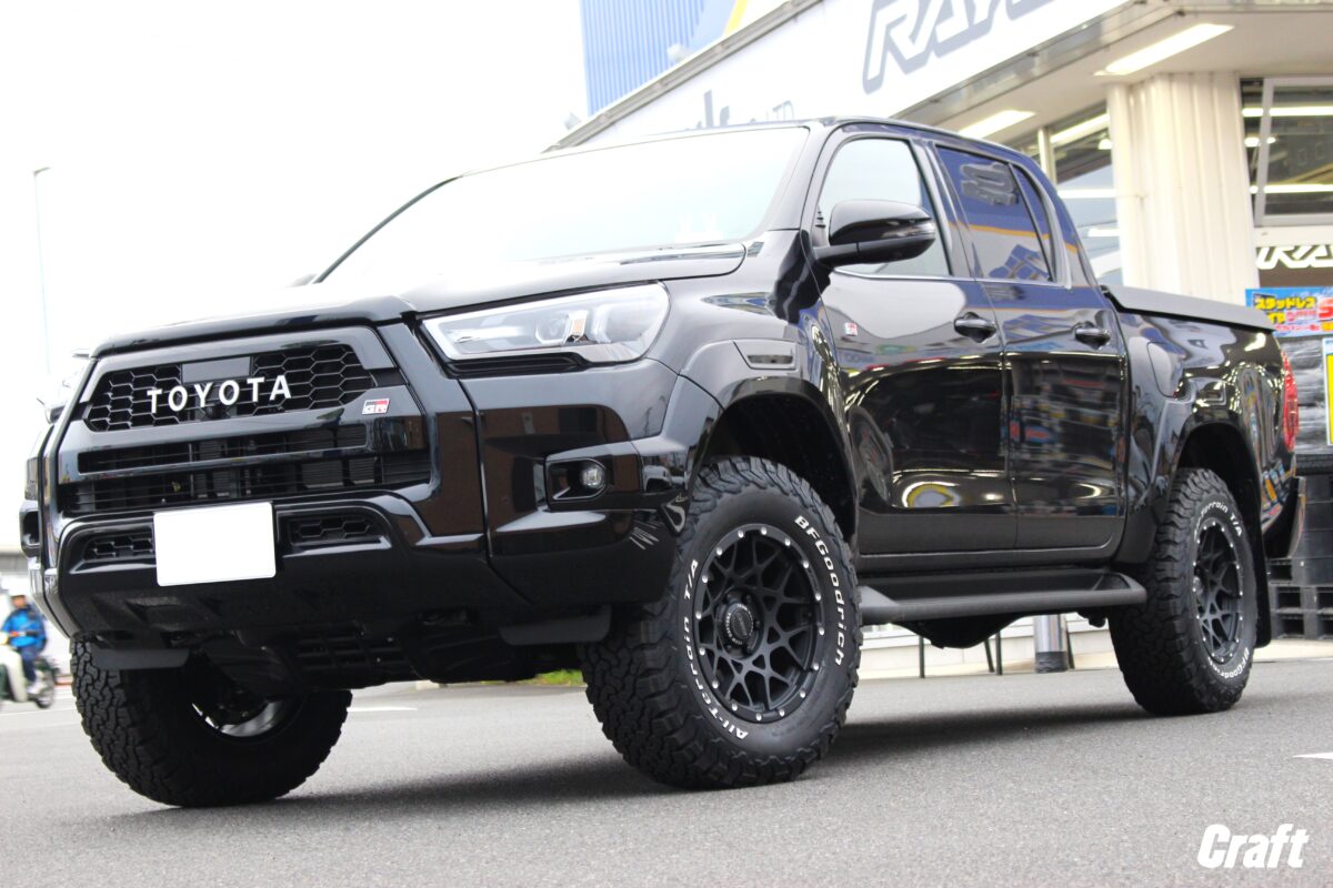 ハイラックスは外径アップしたタイヤサイズを装着するにはリフトアップ作業は必須。