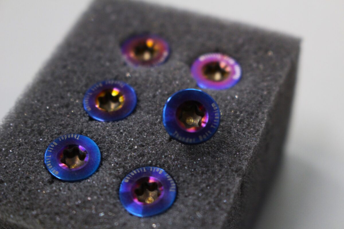 チタン特有の焼き色とビスに刻印されている"Thunder Bolt Titanium"のロゴがグッとくるのは私だけ??(^^;